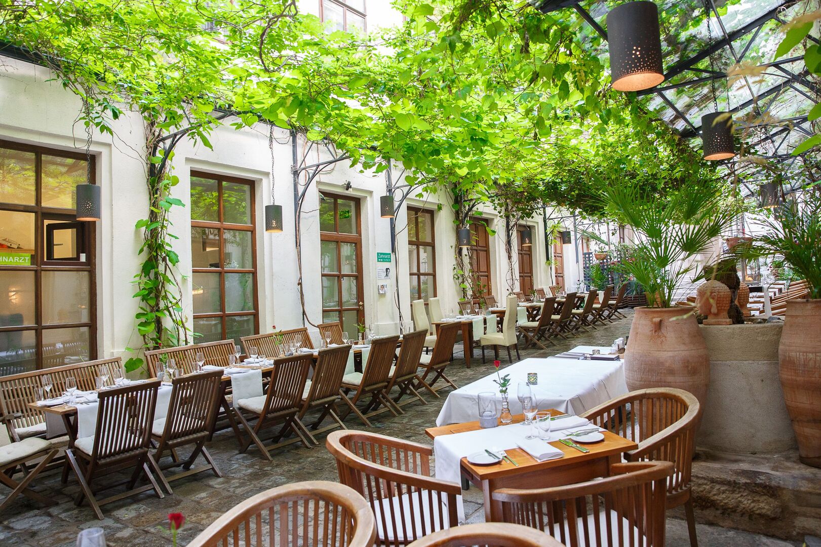 Einer der schönsten Gärten der Stadt befindet sich im Palais Coburg. Bei Clementine im Glashaus (1010, Coburgbastei 4) sitzt man eben auch draußen wie eine Prinzessin.