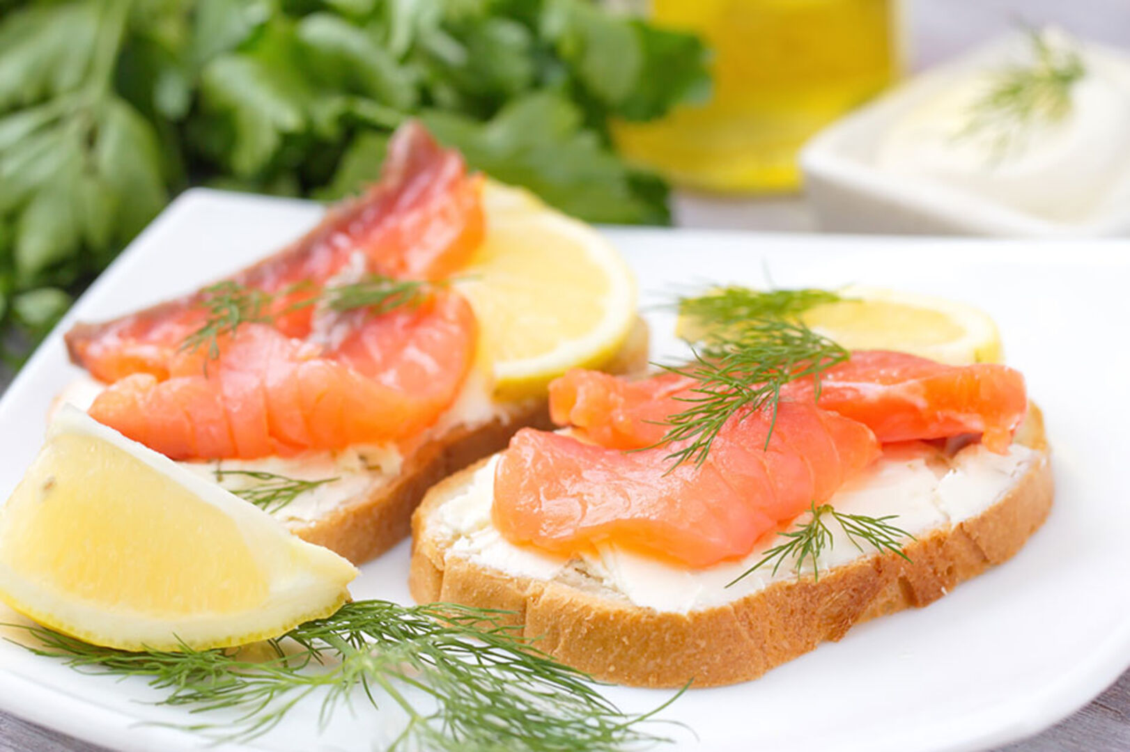Zuerst geben Sie das Toastbrot ins Backrohr oder den Toaster. Das Brot sollte goldbraun sein. Danach können Sie einfach Frischkäse oder Butter auf den Toast geben und geräucherten Lachs darauf. Till verfeinert den schmackhaften Abendsnack.