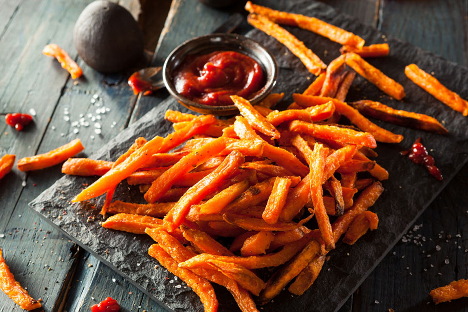 Die süßlichen Kartoffel werden einfach in Stifte geschnitten und mit etwas Öl und Kräutern beträufelt. Danach wandert alles ins Backrohr.