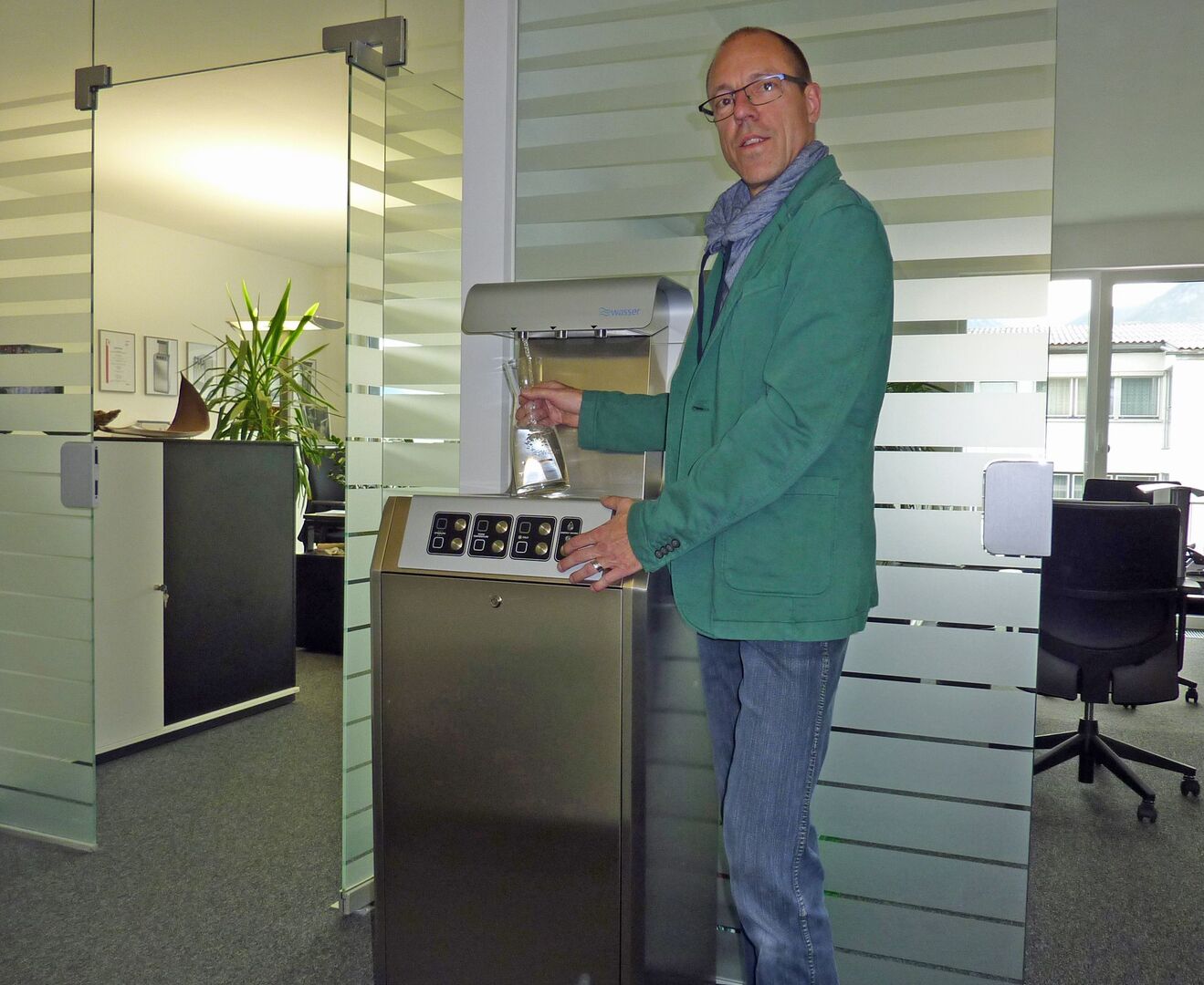 Christian Erd, Technischer Leiter von wellwasser, zeigt die Business-Lösung. Im Standgerät sind Wasseraufbereitung, Kühlung und Karbonisierung integriert…
