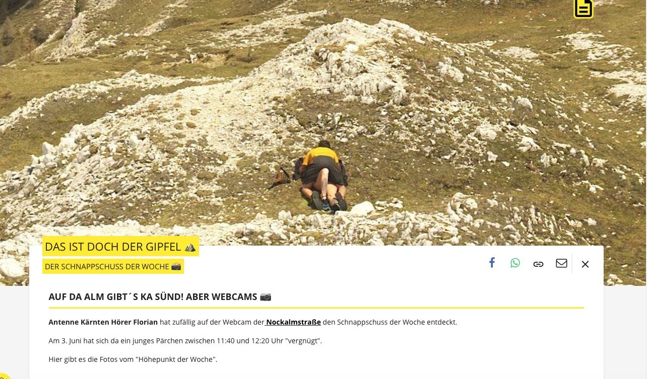 Ein Höhepunkt war dem Pärchen anscheinend nicht genug. Ein Antenne-Kärnten-Hörer machte große Augen, als er sich die Webcam der Nockalmstraße genauer anschaute und dabei ein Pärchen entdeckte, das sich direkt vor der Kamera am Gipfel auf rund 2000 Meter Seehöhe vergnügte. Dass sie die Berge für sich hatten, nutzten die beiden aus. Dass jedoch ihr Schäferstündchen für die Ewigkeit festgehalten werden würde, damit hatten sie wahrscheinlich nicht gerechnet. Immerhin: Die Aufnahmen sind qualitativ zu schlecht, um die beiden genauer zu erkennen. Tja, auf der Alm gibt es wirklich keine Sünde!