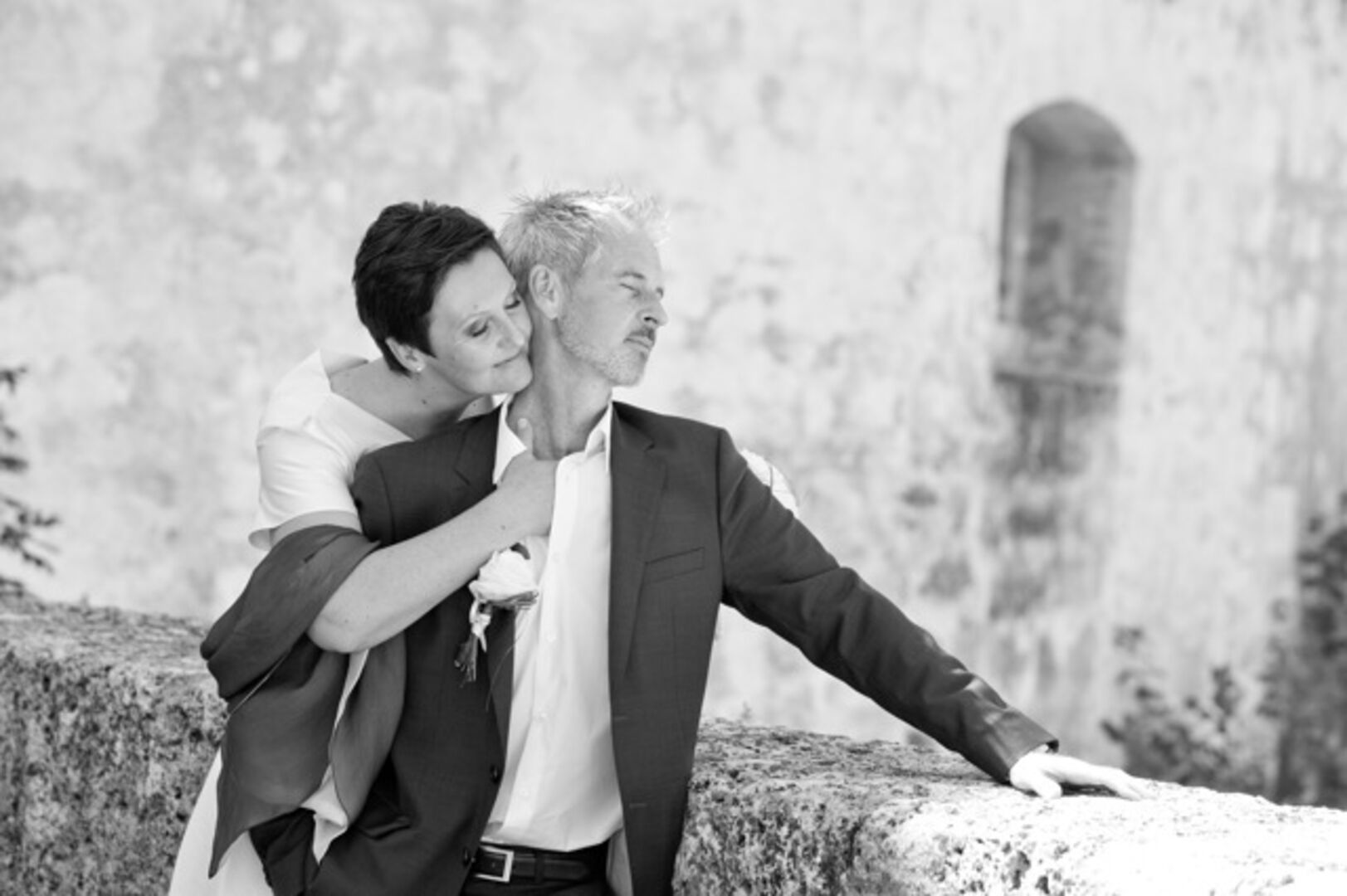 Norbert u Lisa Egger, 16.06.16 im Garten des Standesamts in Olbia. Paar seit 9 J., heuer auf Sardinien heimlich zu zweit geheiratet. Postkarten mit diesem Foto…