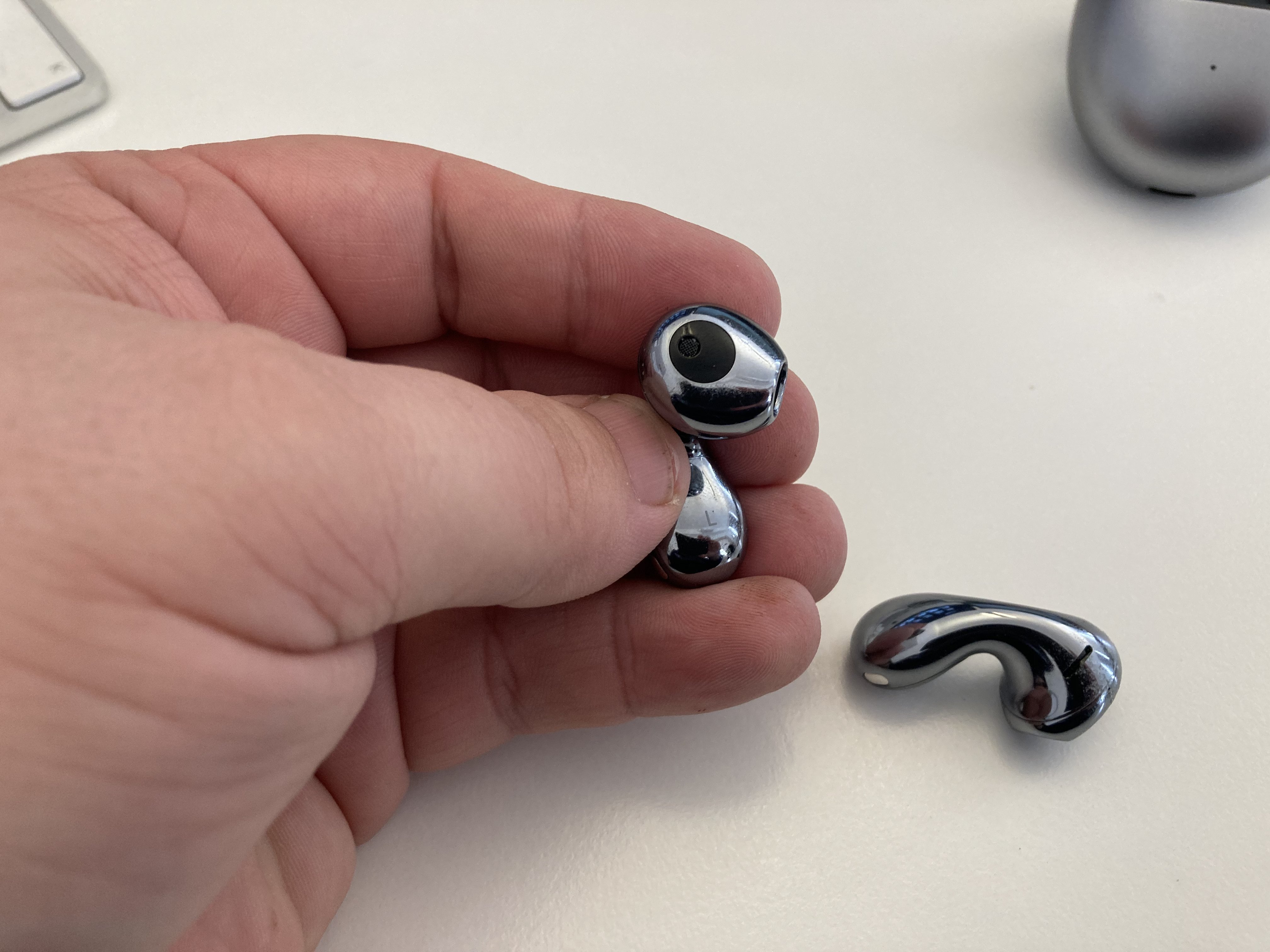 Die Buds sind also in Tropfenform gestaltet und werden - anders als In-Ears- in das Ohr eingehängt. Das kann bei vielen Ohren gut gehen, bei einigen aber auch schief. Leider fallen meine Ohrwascherl anscheinend in letztere Kategorie. Die FreeBuds 5 sitzen extrem leicht darin und ich habe ständig Angst, dass sie herausfallen. Leider ist es mir auch einmal auf der Straße passiert, ich konnte den kleinen abgängigen Bud aber retten. Die optional mitgelieferten Silikon-Aufsätze leisten hier leider keine Abhilfe.