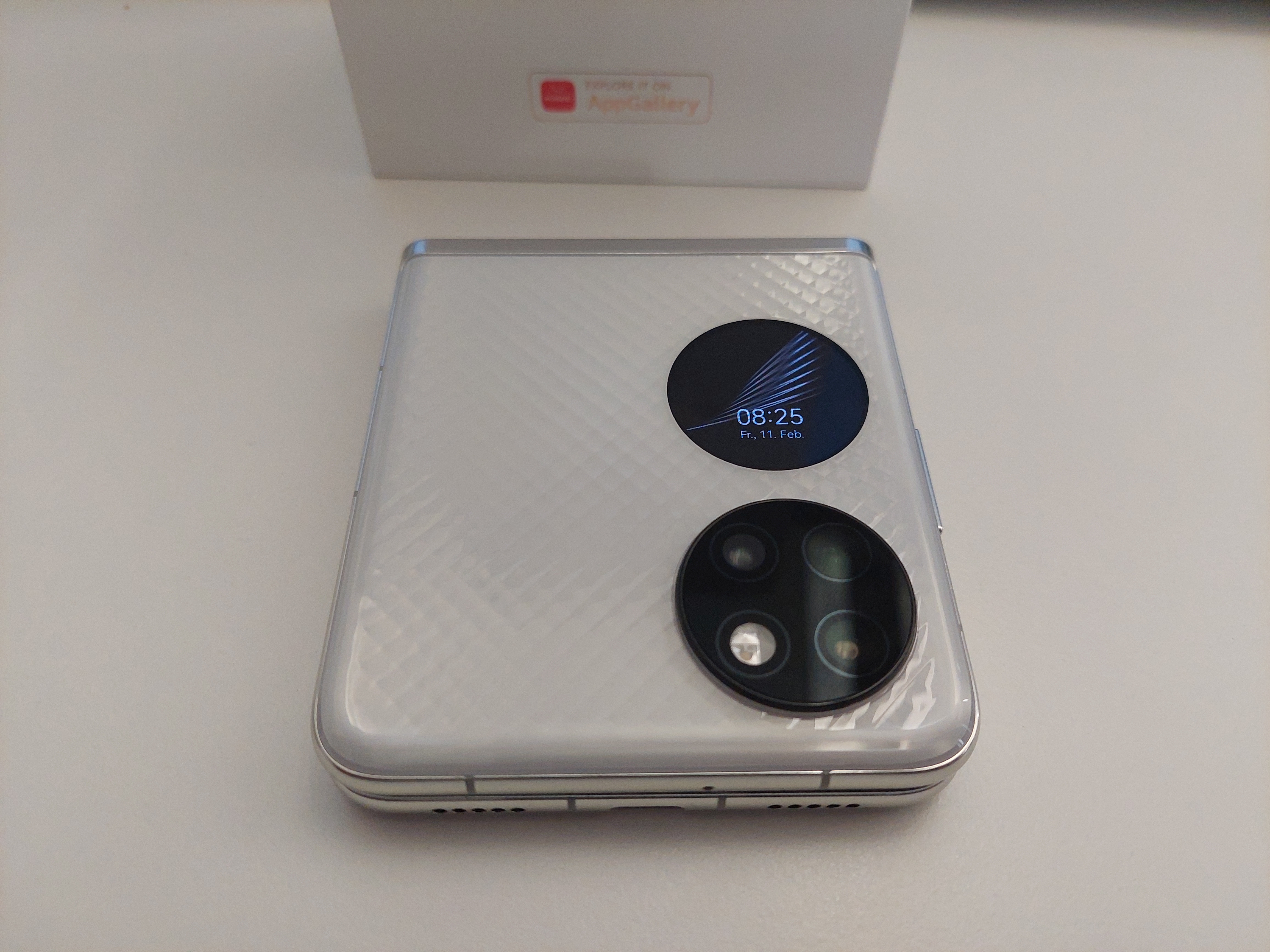 Fangen wir mit dem oberflächlichen Teil an. Huawei hat wieder einmal in die Vollen gegriffen und einen rausgehauen. Das P50 Pocket ist wirklich wunderschön designt und greift sich total hochwertig an. Die leicht geriffelte Oberfläche gefiel zwar nicht jedem, mir persönlich aber ganz gut. Im zugeklappten Zustand ist das Gerät superflach und klappt vollständig zu, es bleibt kein Spalt zwischen den beiden Hälften. Das wirkt sich auch auf den ausgeklappten Zustand aus, denn die Falte im Display ist, verglichen zum Mitbewerber Galaxy Flip, sehr dezent und kaum spürbar. Tolle Leistung! Kamerahügel und Außendisplay (1-Zoll, OLED) fügen sich perfekt ins Gesamtbild ein.