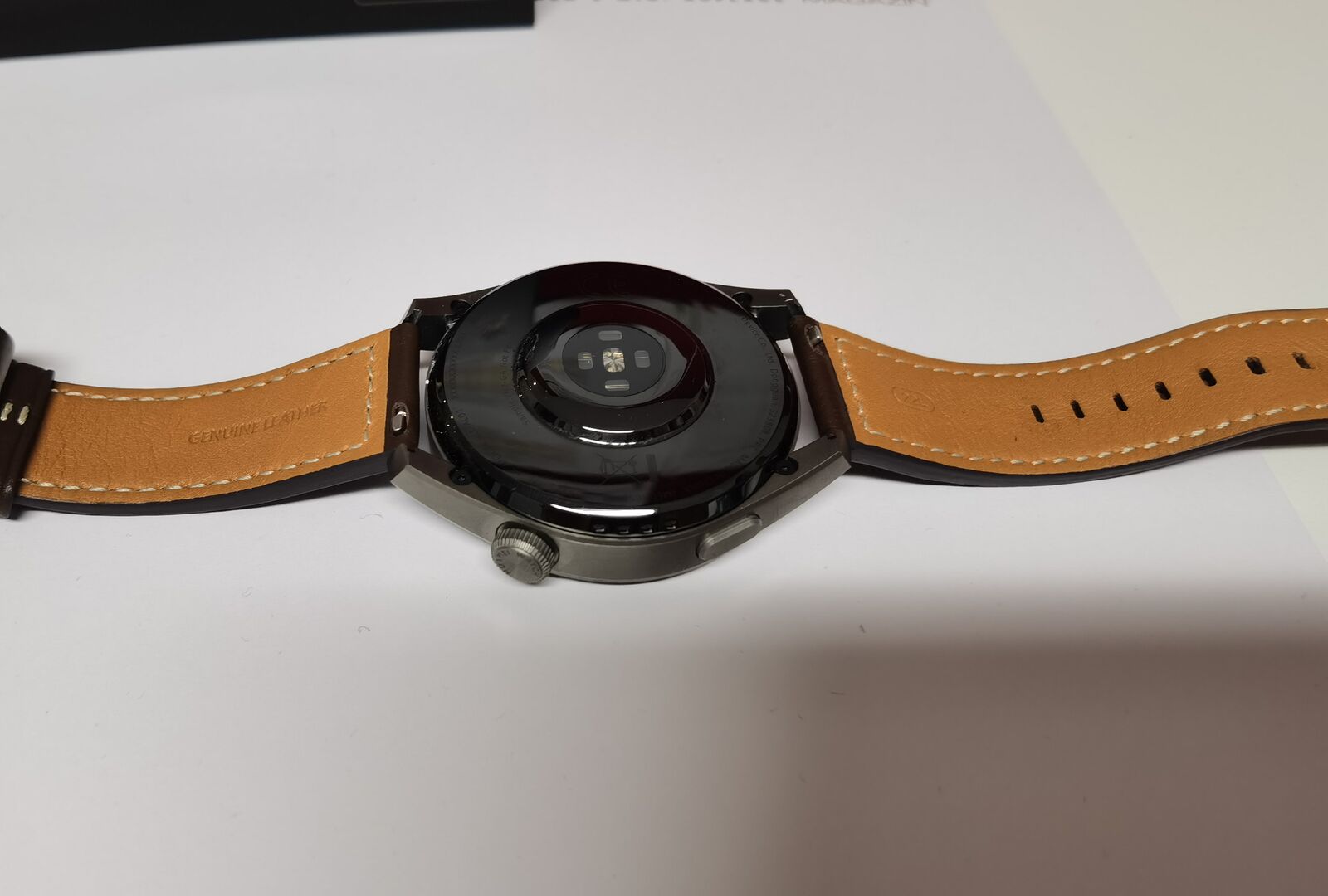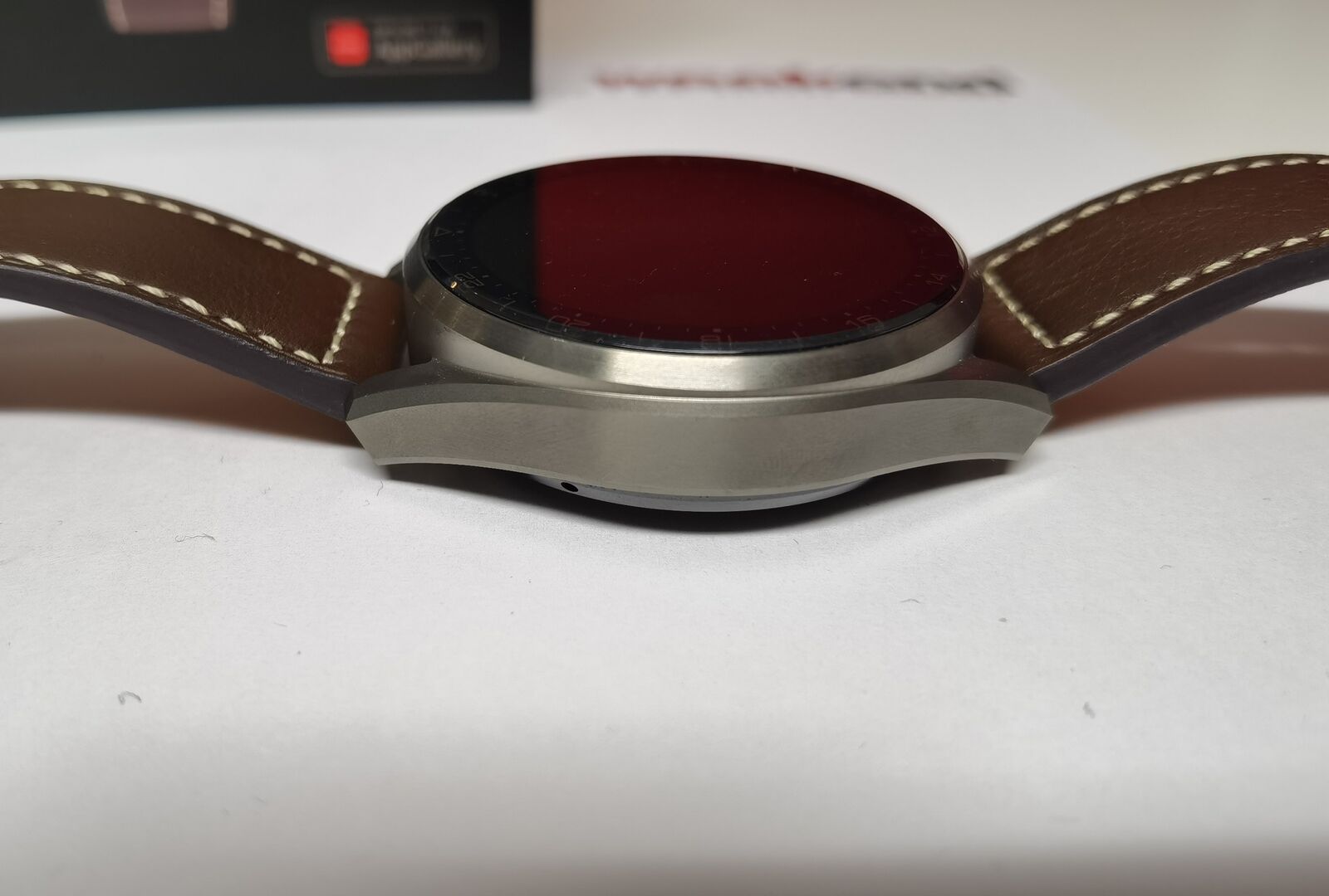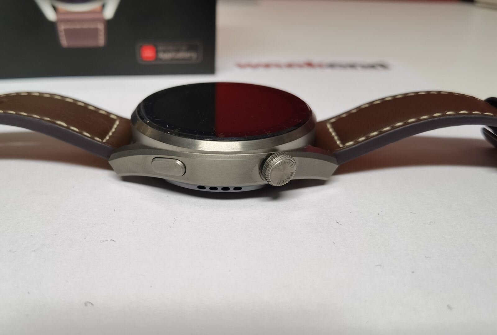Schon beim Auspacken des Testgeräts wird es edel! Das Gehäuse besteht aus Titan und Keramik, das Band ist aus Leder. Hier wurde geklotzt und nicht gekleckert. Mit 63 Gramm fühlt sich die Uhr auf dem Handgelenk auch nicht besonders schwer an. Auf der rechten Seite befinden sich zwei Knöpfe, einer davon ist drehbar (ähnlich wie bei der Apple Watch) und der andere ein normaler Druckknopf. Mehr Knöpfe gibt es nicht. Insgesamt ist die Watch 3 Pro eine der hochwertigsten Smartwatches, die ich je an der Hand hatte. Beim Design hat Huawei alles richtig gemacht.