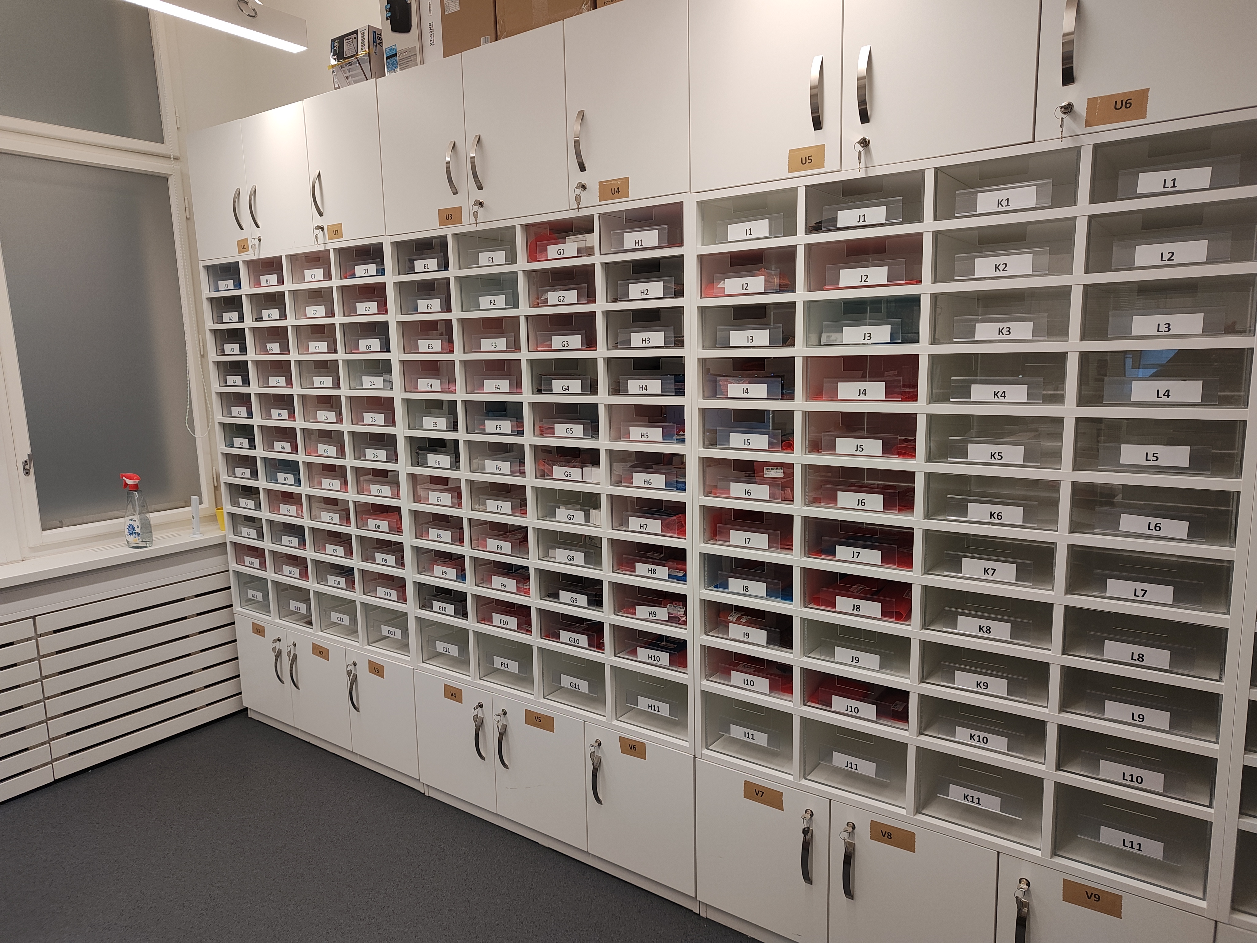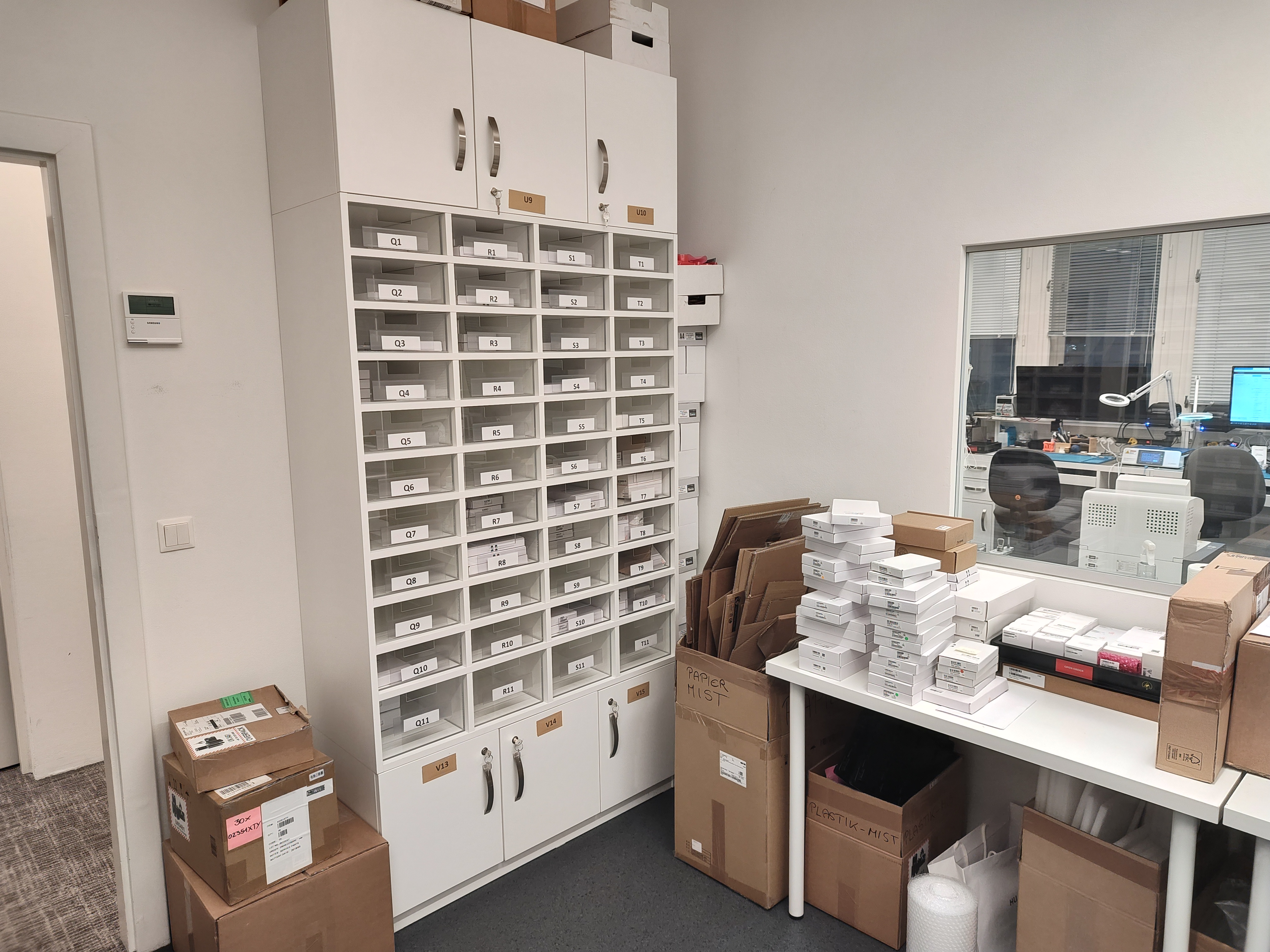 Bevor es ans Eingemachte ging, bekamen wir eine Führung durch die Reparaturwerkstatt. Die befindet sich im dritten Stock, genau über dem Huawei-Flagship-Store. Defekte Geräte kommen per Lastenaufzug in die Werkstatt und werden direkt dort von mehreren Mitarbeitern übernommen. Einen großen Teil der Werkstatt nimmt das Ersatzteillager ein. Dort wird danach getrachtet, dass jedes Teil lagernd ist um eine superschnelle Reparatur zu ermöglichen. Eine eigene Mitarbeiterin kümmert sich exklusiv um Bestellungen und schaut, dass die Lager gut gefüllt sind. Wie uns verraten wird, hat die derzeitige Knappheit am Weltmarkt wenig Auswirkungen und Huawei kann eine schnelle Reparatur gewährleisten.