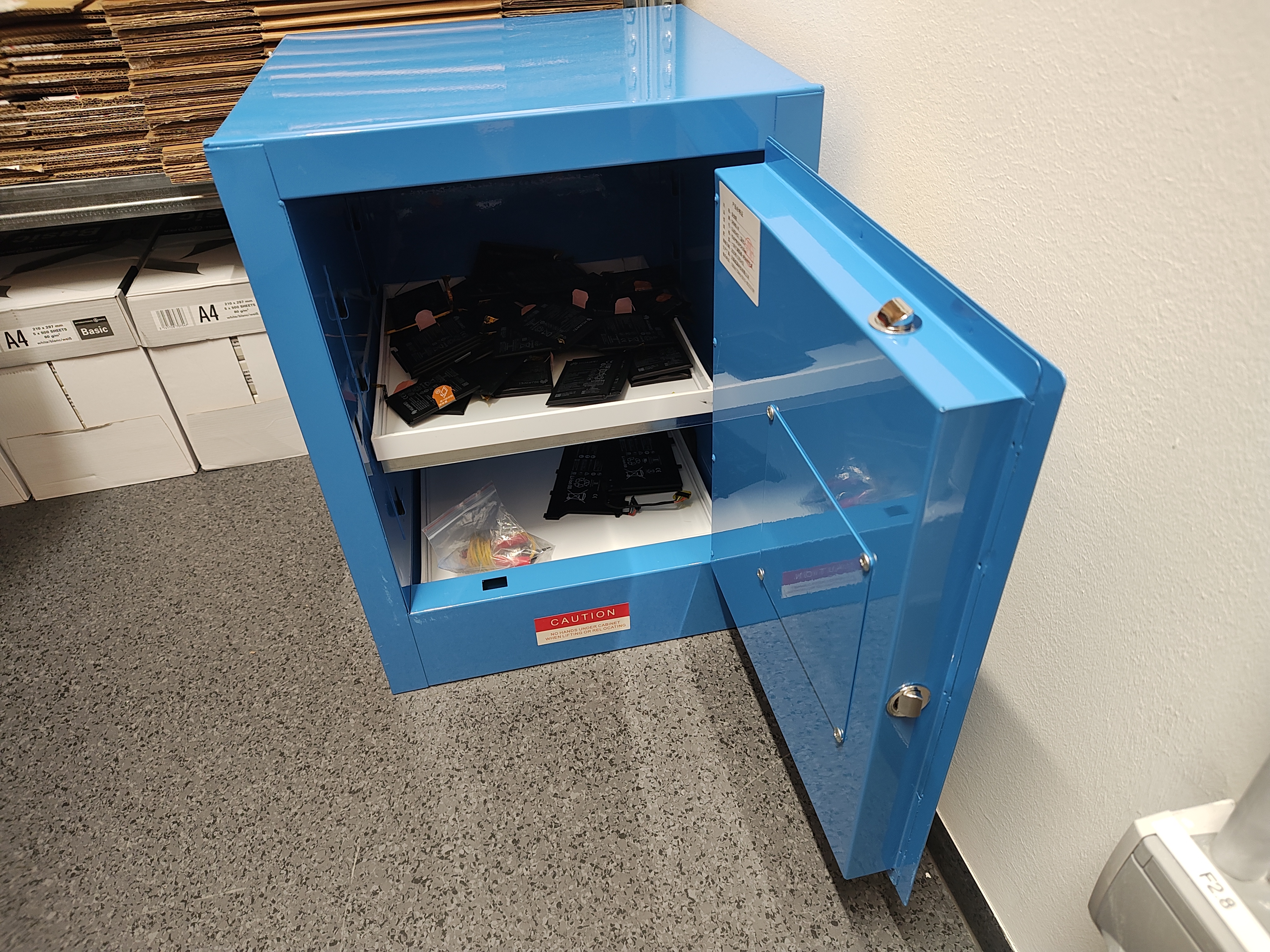 Spannend wird es, als uns Kooldeep in einem kleinen Nebenraum einen blauen Tresor zeigt. Wir vermuten darin die geheimen Bargeldreserven des Huawei-Stores, es kommt aber ganz anders. Als Kooldeep den Tresor öffnet geht uns ein Licht auf. Es sind die Akkus der Geräte die darin gelagert werden müssen. Akkus sind höchst sensible Teile und können bei der kleinsten Beschädigung Feuer fangen, explodieren oder sich aufblähen. Deswegen müssen jegliche Batterien, egal ob defekt oder einfach so ausgebaut, in diesem Tresor gelagert werden. Kommt es zu einem Problem, ist dieser feuerfeste Tresor sozusagen die Lebensversicherung der Werkstatt und damit auch des gesamten Gebäudes.