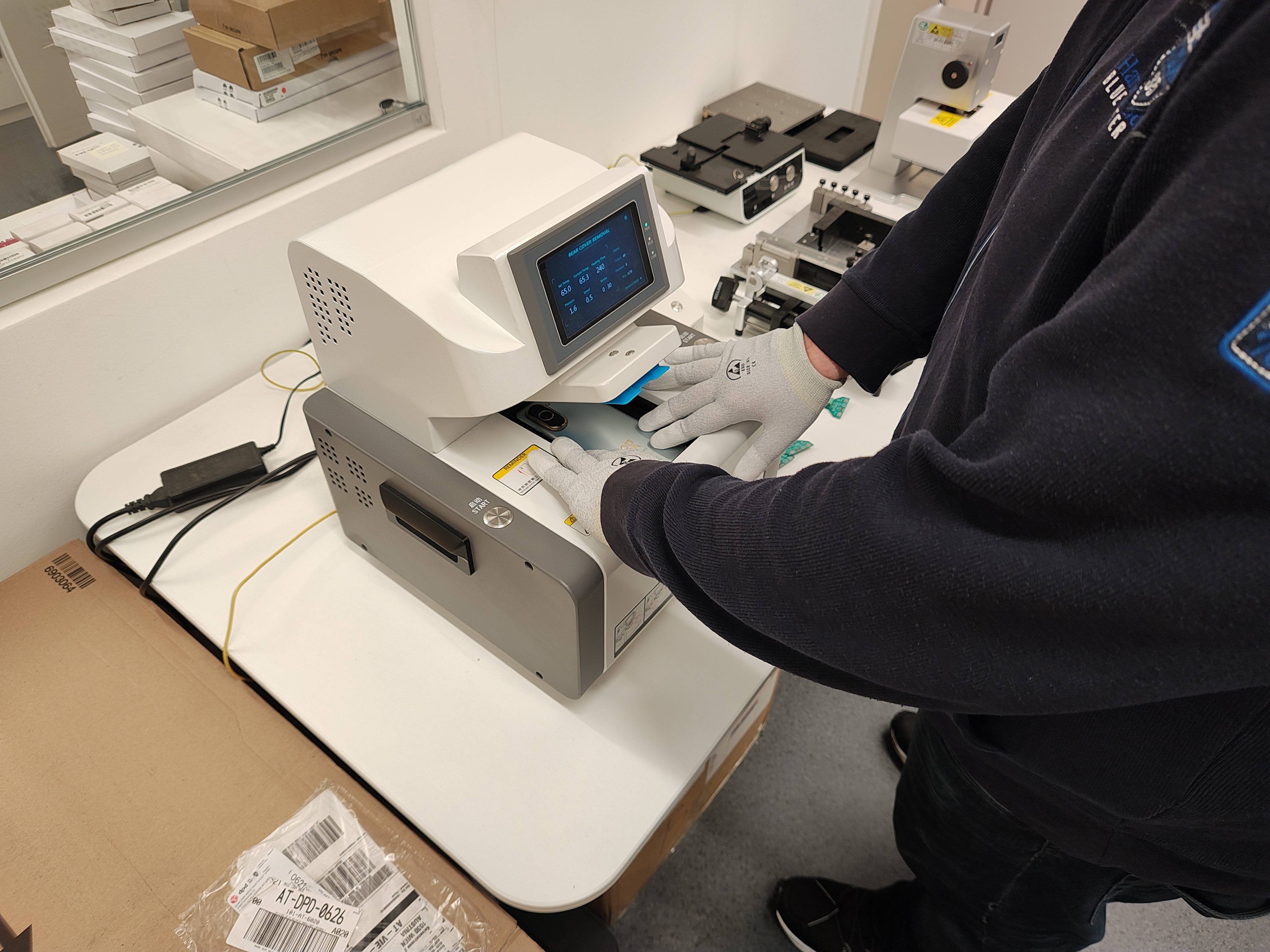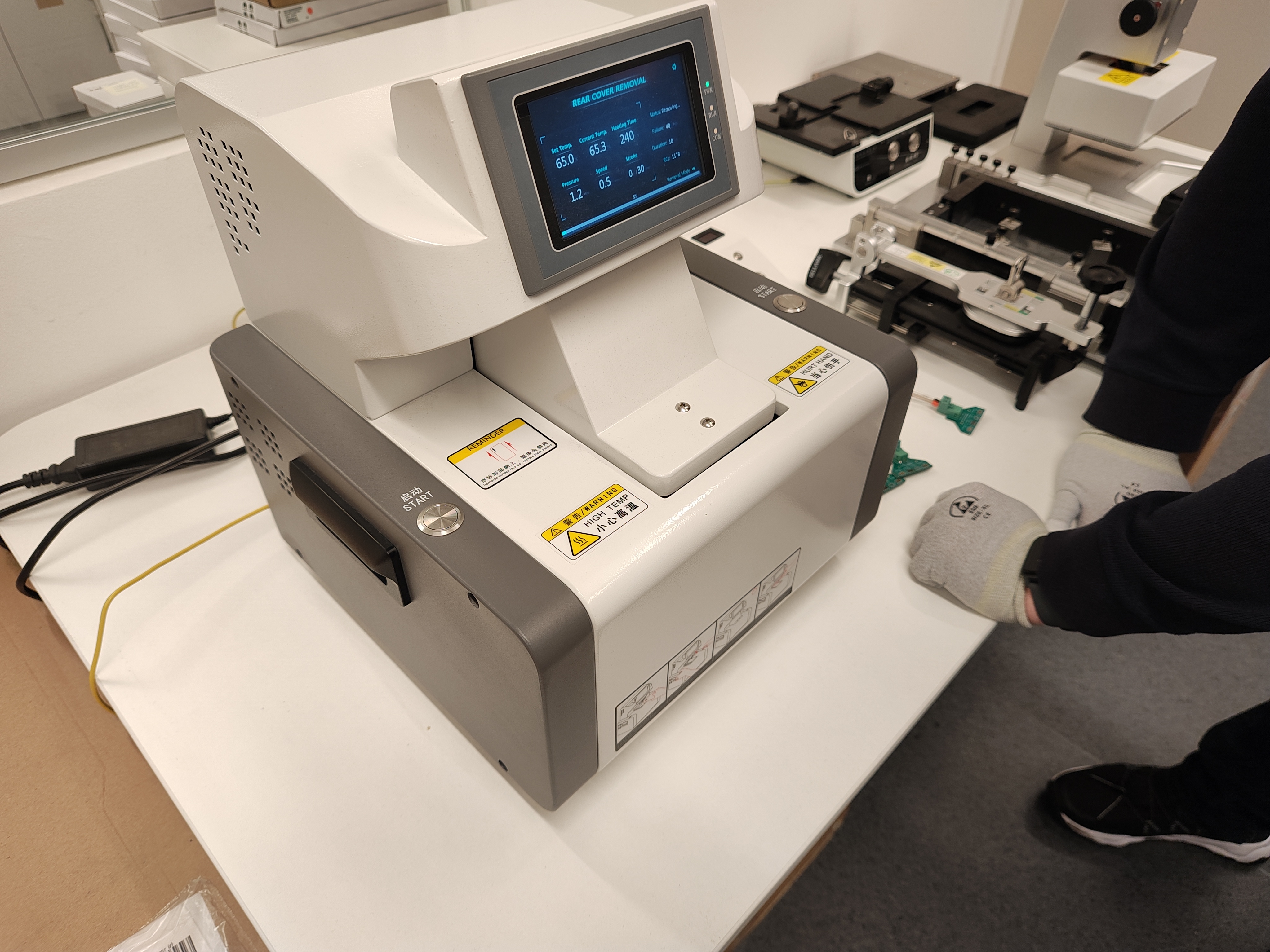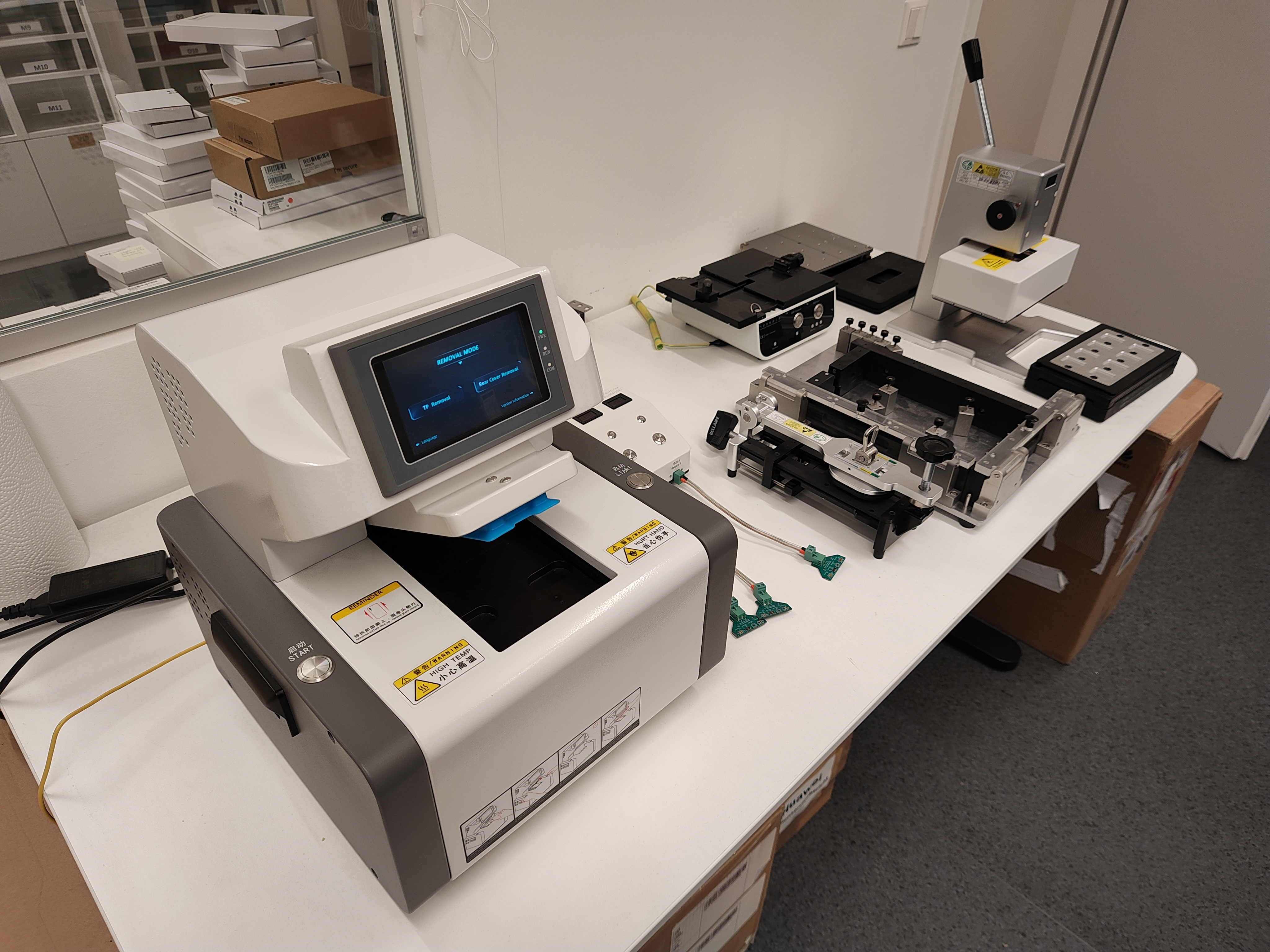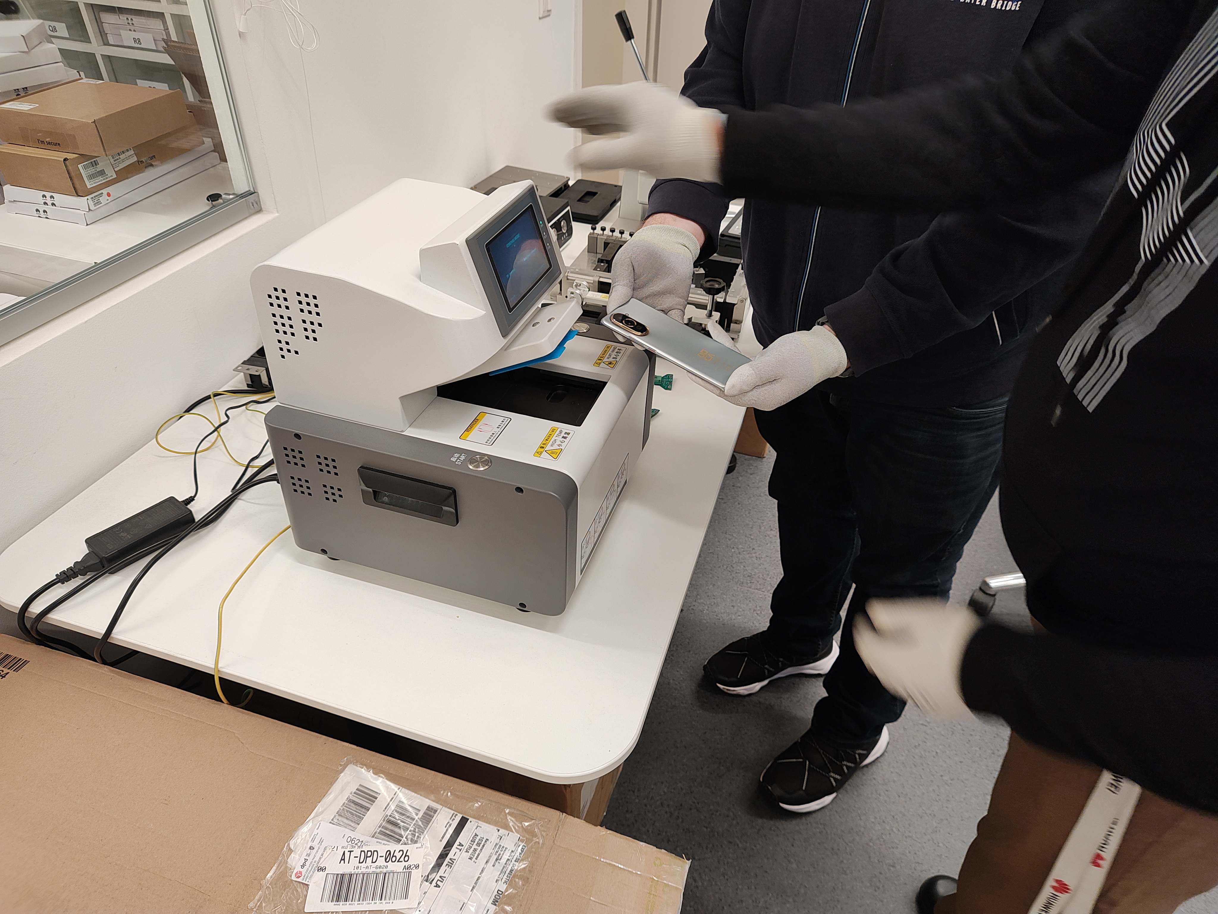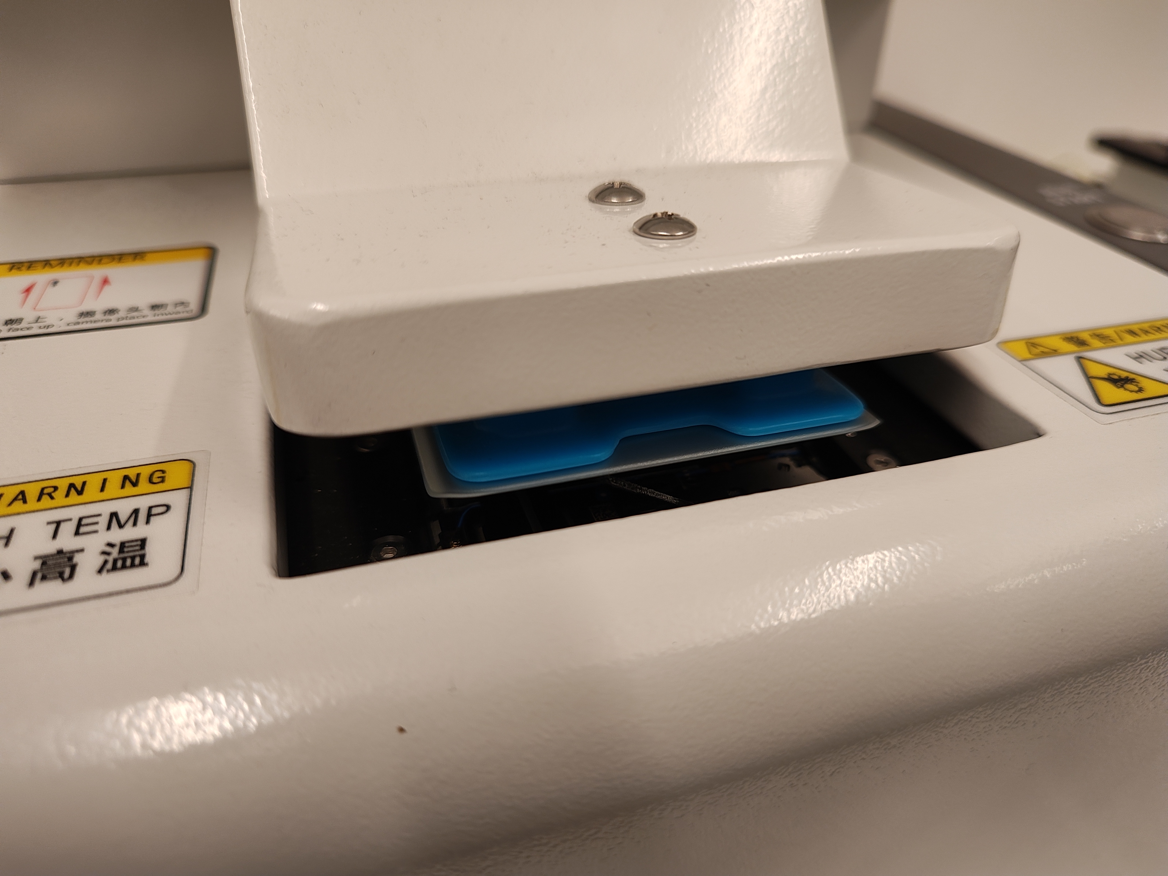 Jetzt dürfen wir selbst Hand anlegen und ein (funktionierendes) Nova 10 auseinanderbauen um uns das Interieur anzuschauen und es dann wieder zusammenzusetzen. Kooldeep zeigt uns ein Schulungsvideo und los gehts. Die Hinterseite des Geräts wird mit einer speziellen Maschine entfernt, da das wasserdichte Smartphone stark verklebt ist. Die Maschine erhitzt die Rückseite auf rund 65 Grad und hebt den Deckel dann ab.