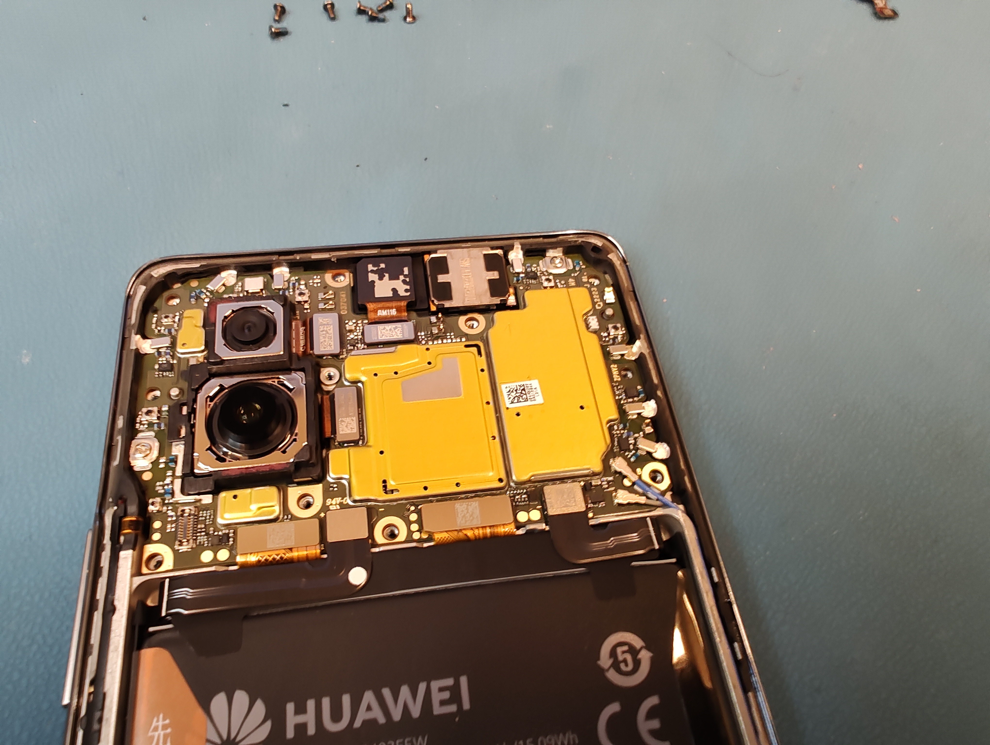 Ohne Maschine bräuchte man dafür einen Föhn und ordentlich Muckis. Dann schrauben wir die Kameras runter um uns zum Motherboard des Geräts vorzuarbeiten. Rund 14 Schrauben müssen runtergeschraubt werden, bevor man das Motherboard lösen kann. Auch den heiklen Akku dürfen wir entfernen. Die Arbeit ist fitzelig und erfordert höchsten Fingerspitzengefühl. Das hat Kooldeep, er zeigt uns vor wie es geht und dann dürfen wir es versuchen.