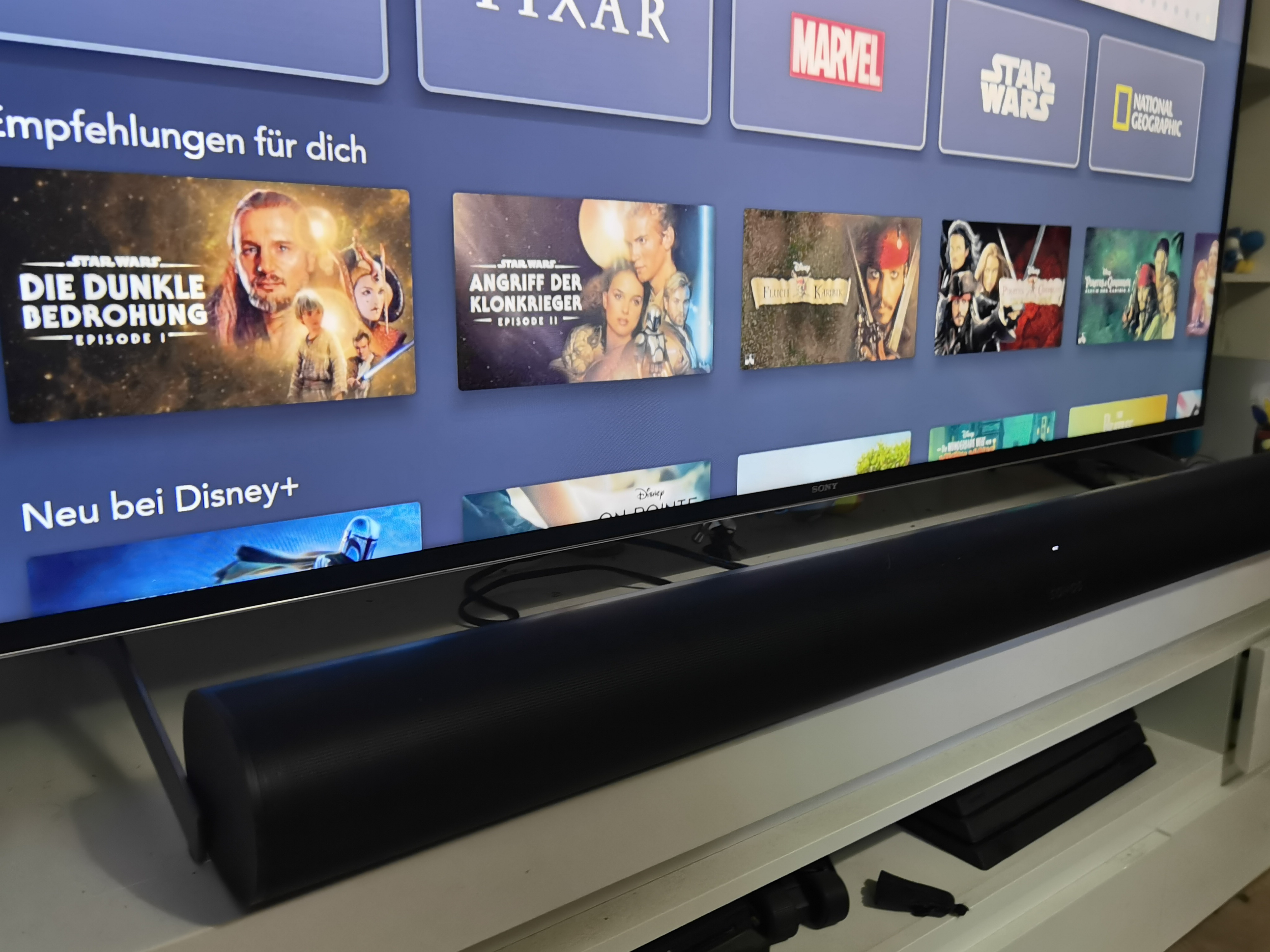 Wenn aber die technischen Voraussetzungen passen, dann kann es schon zu Problemen mit den Nachbarn kommen, denn die Arc liefert als Standalone-Soundbar schon ordentlich ab. Das Setup aus mehreren Lautsprechern haut einem den Sound ordentlich um die Ohren und bietet auch einiges an Bass, wenn auch weniger als mit einem extra Subwoofer. Ich musste aufpassen, den Sound nicht allzulaut aufzudrehen um nicht die Kündigung für die Wohnung zu bekommen. Vor allem modernere Inhalte auf Disney+, die eine Atmos-Soundspur bieten sind hervorragend abgemischt und bieten Kinofeeling par excellence. Einziger minimaler Kritikpunkt: Die Stimmen sind oft nicht zu 100% verständlich, das liegt aber auch an der Abmischung des Sounds der Studios und nicht unbedingt an der Arc. Auch bei anderen Soundbars mit Atmos leidet nämlich manchmal die Verständlichkeit von Sprache. Aja und wer die Sonos Arc erweitern will, bekommt Subwoofer und Rear-Lautsprecher extra dazu. Die funktionieren wireless und machen aus der eh schon hervorragenden Arc ein gigantisches Surround Setup.