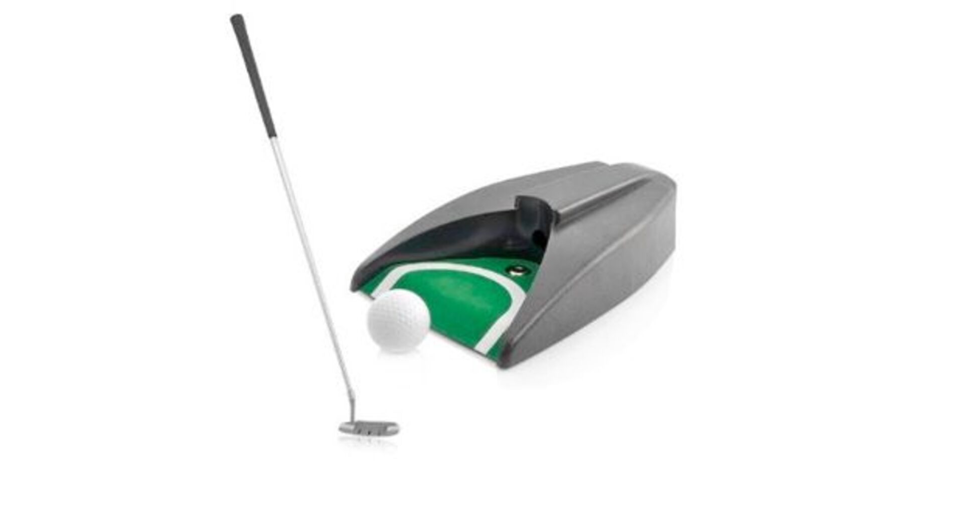 Mit diesem Indoor-Golfset können Sie auch im Büro üben! Das Set nimmt kaum Platz weg – es besteht aus einem Golfball, einer Put Maschine und einem Putter, den man im Handumdrehen selber zusammenbaut -– und ist ein idealer Zeitvertreib für die Mittagspause. Gesehen um 41,21 Euro