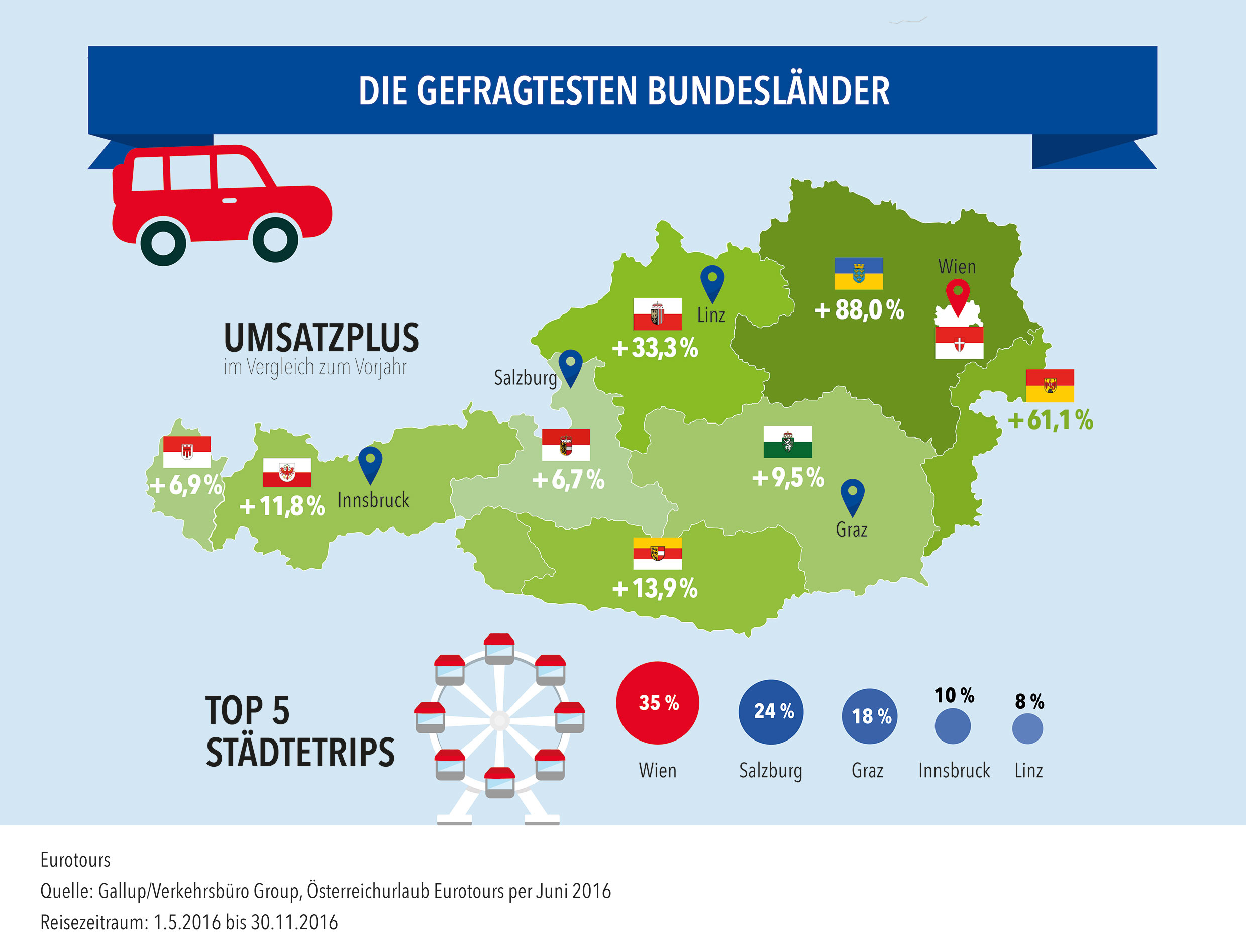 Die meisten Eurotours-Kunden verbringen ihren Österreich-Urlaub in Tirol (Umsatzplus 11,8 Prozent), gefolgt von Salzburg (plus 6,7 Prozent), Kärnten (plus 13,9 Prozent), der Steiermark (plus 9,5 Prozent) und Vorarlberg (plus 6,9 Prozent). Besonders stark profitiert Oberösterreich mit 33,3 Prozent, Niederösterreich mit 88,0 Prozent und das Burgenland mit 61,1 Prozent.