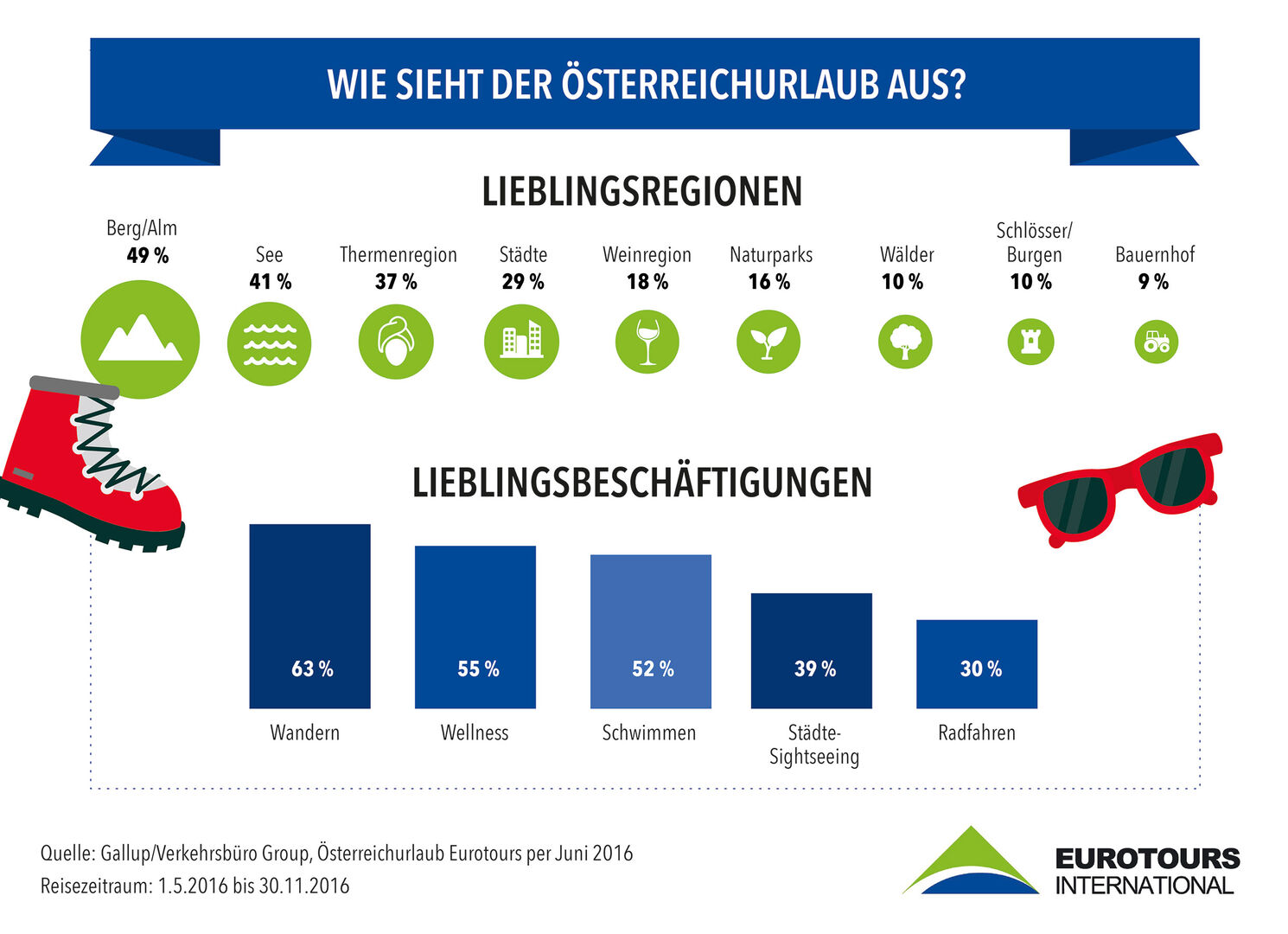 Urlaub in den Bergen (49 Prozent), an Seen mit bester Wassergüte (41 Prozent) oder in Thermenregionen (37 Prozent) sind die heimischen Spitzenreiter. Weinregionen machen 18 Prozent und Naturparks 16 Prozent auf der Beliebtheitsskala aus. Herr und Frau Österreicher sind im Urlaub aber nicht faul, sondern im Gegenteil durchaus sportlich. 63 Prozent haben Wanderschuhe im Gepäck, mehr als die Hälfte die Badehose und jeder Dritte geht Radfahren (lt. Gallup Umfrage 2016, Verkehrsbüro Group). 29 Prozent tummeln sich in Österreichs Städten, egal ob zum Kultur- oder Shoppingvergnügen. Wien führt das Städteranking an (35 Prozent), gefolgt von Salzburg (24 Prozent) und Graz (18 Prozent).