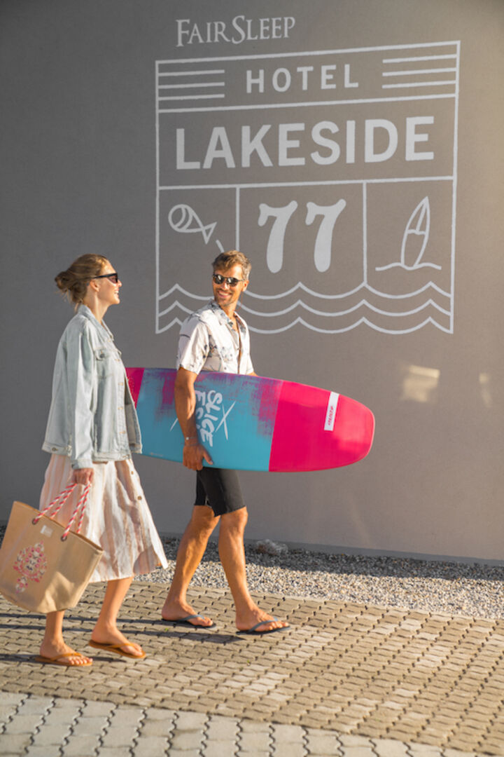 Podersdorf ist nicht nur nah am Wasser gebaut, sondern liegt auch am richtigen – vor allem für alle wilden Vögel, die über die Wellen fliegen wollen. Für sehr viel Naturgenuss, abseits digitaler Einflüsse, empfiehlt Richard Zanki, Geschäftsführer und Inhaber des Hotel Lakeside77, die burgenländische Küste. „Wir sind Urlaub und vermitteln ,good vibes‘“, so Zanki. Neben Kind und Kegel haben auch familieneigene Vierbeiner viel Platz. „Die Familie duscht am Zimmer, aber für die Fellnase haben wir eine Outdoordusche vorbereitet“, freut sich Zanki auf Kite-Boarder ebenso wie auf Bellos. Tolles Extra: Der einzige Hundestrand mit Gratis-Seezugang ist nur 150 Meter entfernt.
