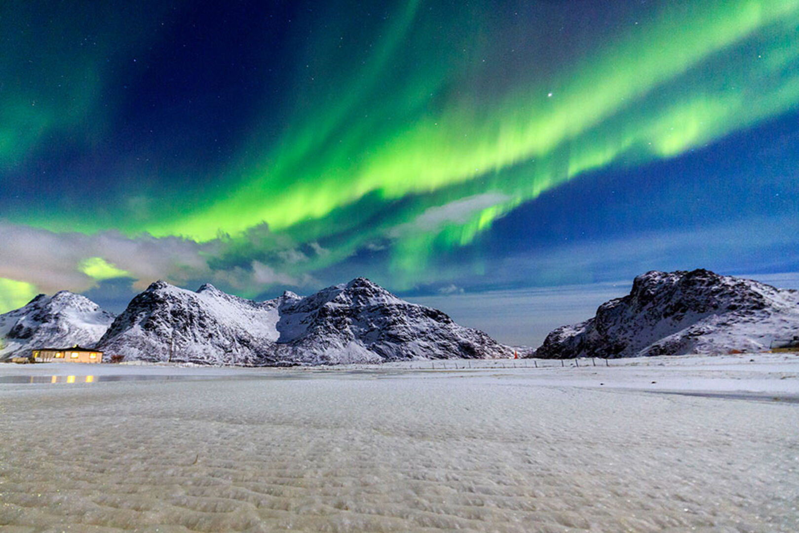 Von einer weißen Schneedecke aus, können die Nordlichter in Flakstad bestaunt werden. In diesem kleinen Ort leben nur rund 1500 Menschen. Trotzdem ist die Idylle definitiv einen Besuch wert.