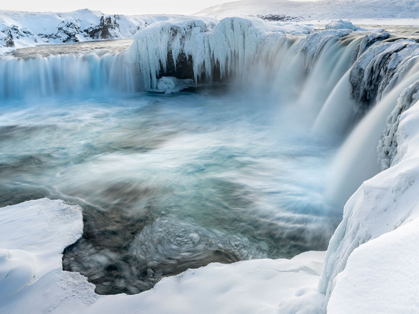 Die atemberaubenden Wasserfälle in Godafoss in Island sind nicht das ganze Jahr über mit Schnee bedeckt. Die Schneeverwehungen lassen das blaue Wasser unglaublich schön aussehen.