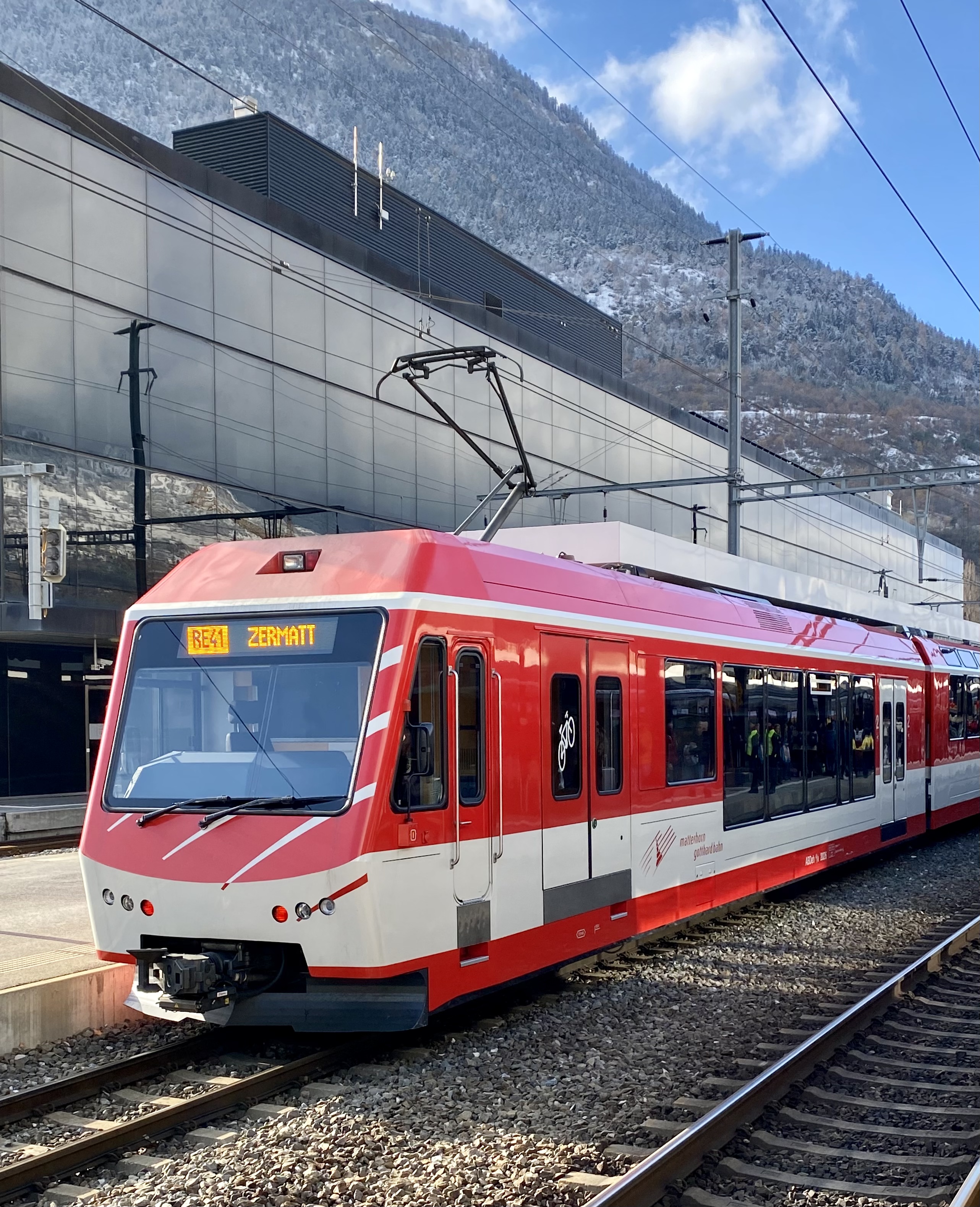In den Kanton Wallis geht es so stressfrei in bequemen Samtsitzen in der ersten Klasse. In gut drei Stunden. Natürlich pünktlich auf die Minute. Wie ein Schweizer Uhrwerk funktioniert auch der Service an Bord. Als Bonus gibt es noch eine große Portion Service oben drauf: Eine gut gelaunte Zugbegleiterin liefert alle notwendigen Infos zum Umsteigen.
