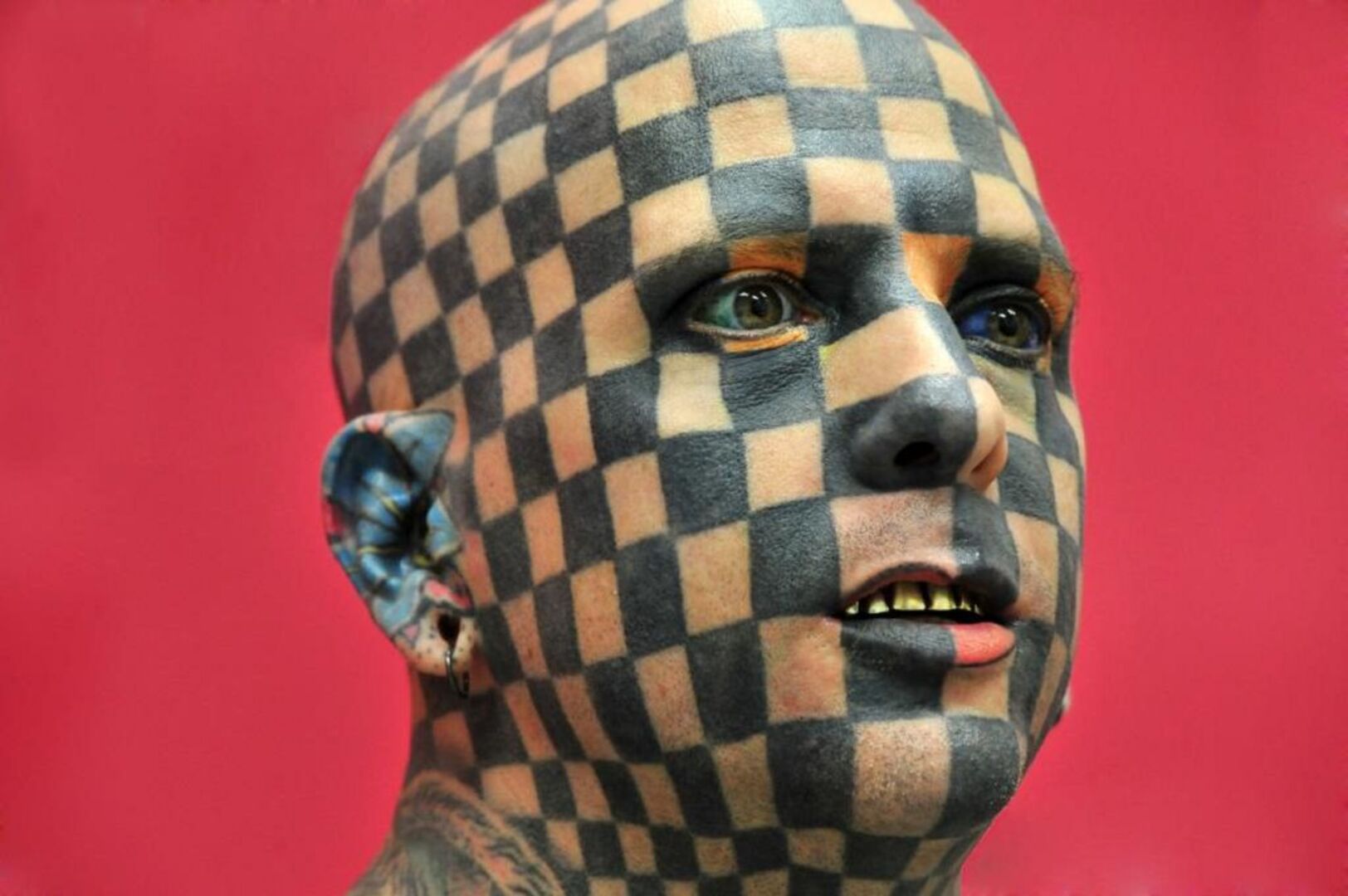 Matt Gone ist das erste Mal bei der Messe dabei. Er bezeichnet sich selbst als das lebende Schachbrett – sein Körper ist zu 99 Prozent tätowiert.