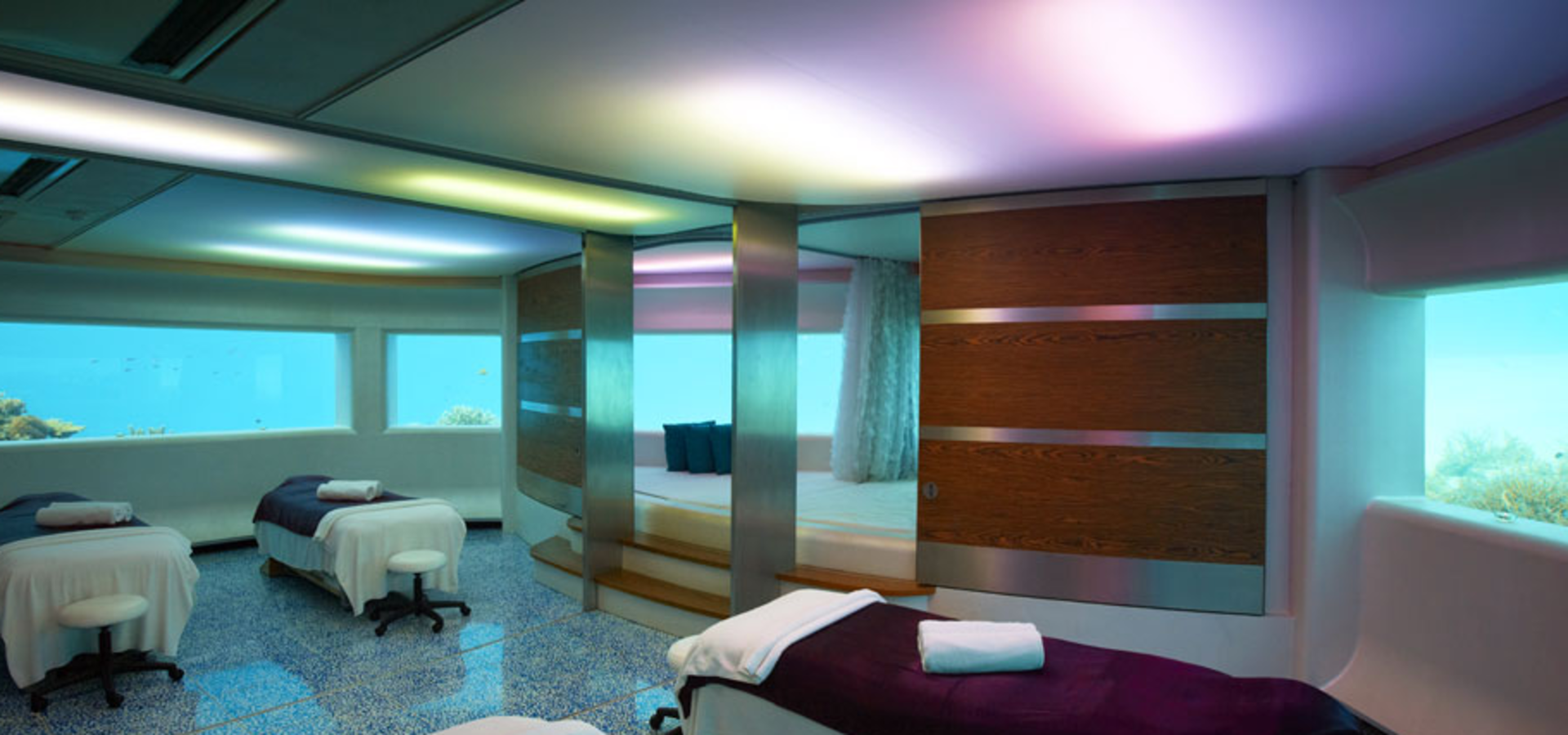 Im Huvafen Fushi, einem der glamourösesten Resorts auf den Malediven, wurde das Spa unter die Wasseroberfläche verlegt. Hier kann man seine Anwendungen genießen und dabei den Fischen im Wasser zusehen.