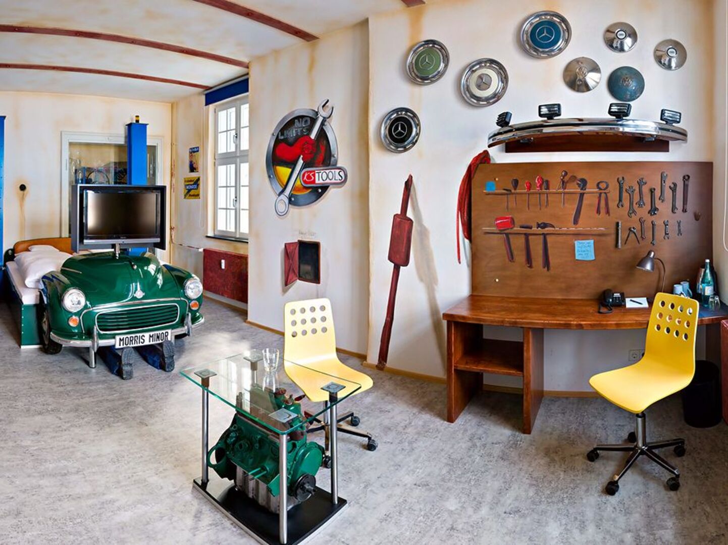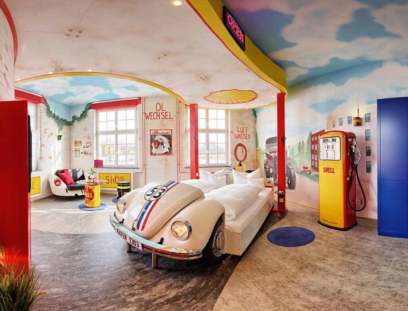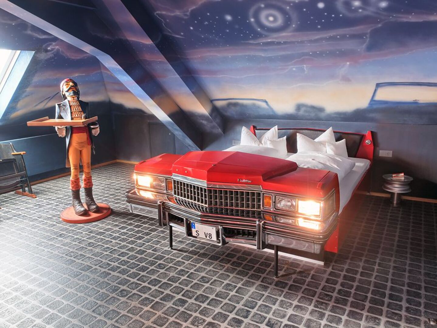 Die Betten in diesem 4-Sterne-Hotel sind Vintage-Automibilen nachempfunden.