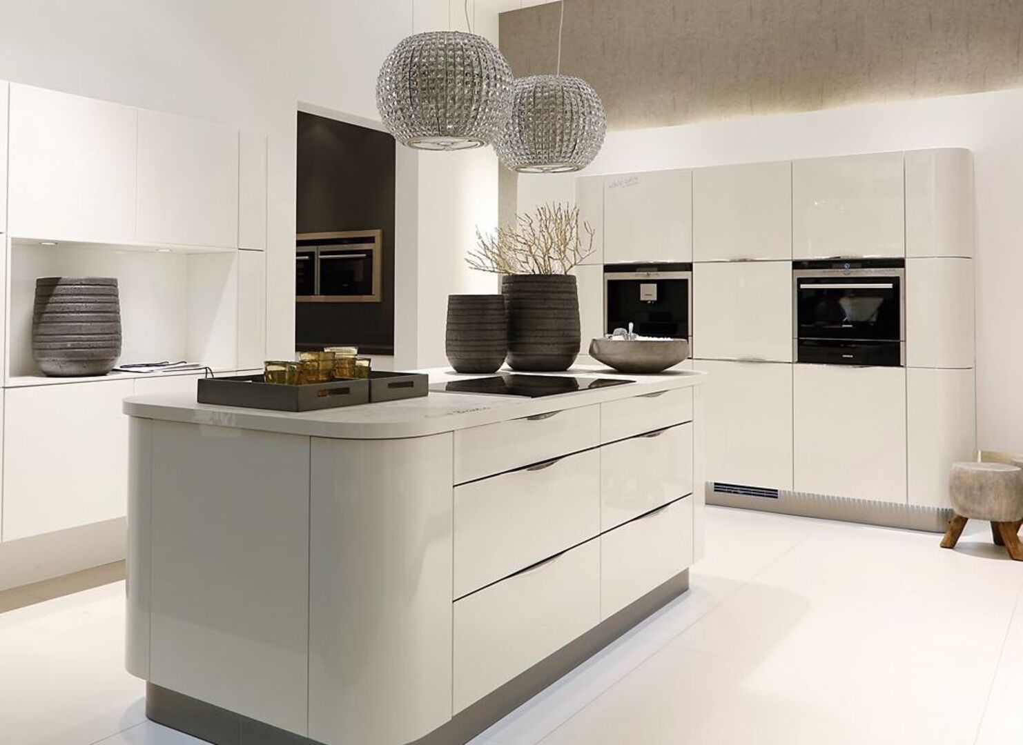 Abgerundete Kanten verleihen Kücheninsel und -kästen eine organische Optik. Selbst die Arbeitsplatte folgt den sanften Kurven, die horizontale Linienführung der Schränke und Schubladen betont zusätzlich die ergonomische Form. Das Innenleben der Schränke ist großzügig gestaltet, damit der perfekte Schwung nicht allzu viel Stauraum wegnimmt. Und da es keine bösen Kanten mehr gibt, sind abgerundete Küchen ideal in Haushalten mit kleinen Kindern.