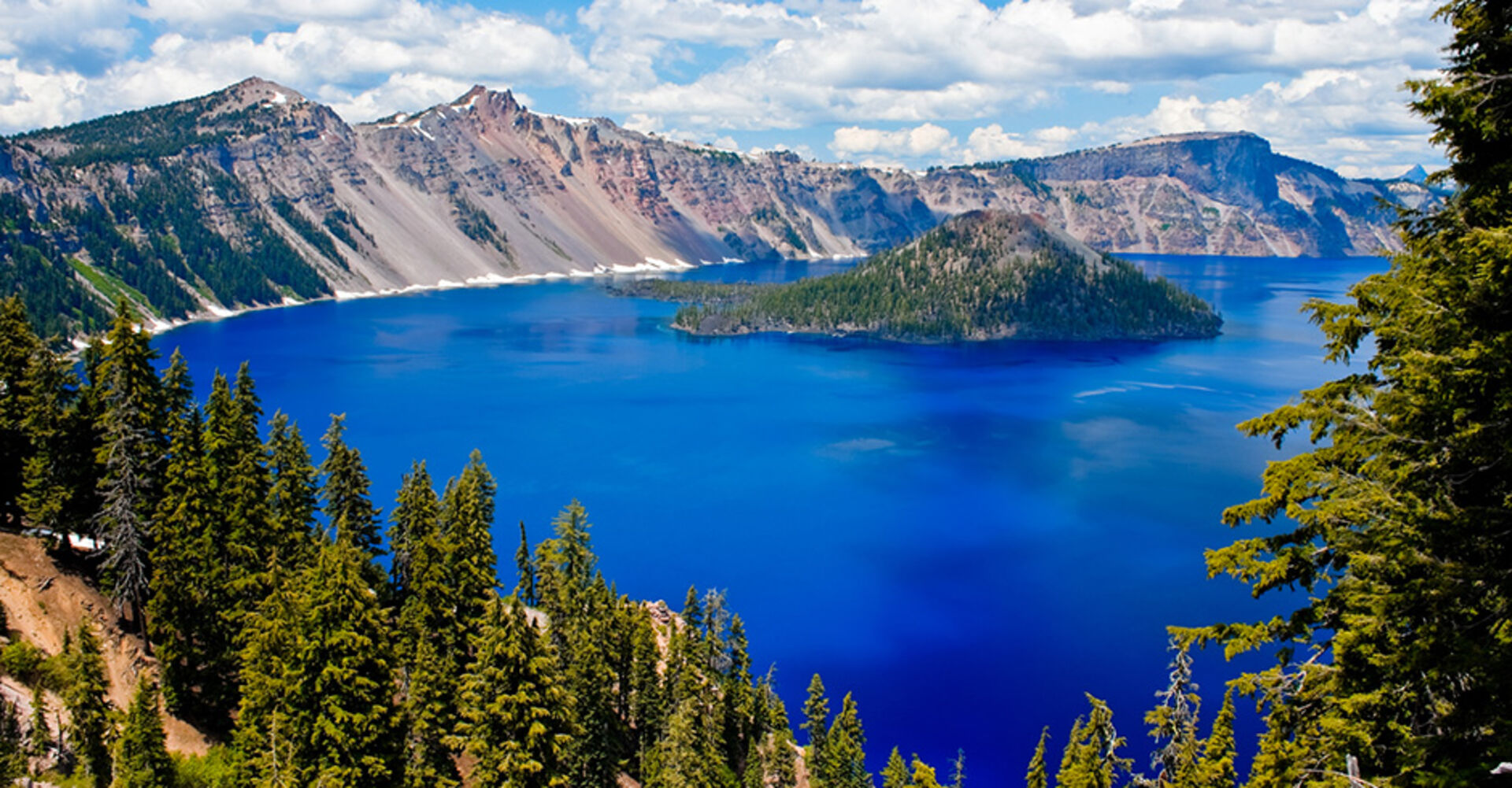 Der Crater-Lake-Nationalpark liegt direkt im Vulkangebiet des "Mount Mazama". Dort befindet sich auch der 594 Meter tiefe Kratersee "Crater Lake", der in tiefblauer Farbe erstrahlt und aus dessen Mitte der Vulkankegel ragt. Wanderwege, Campingplätze und voll eingerichtete Lodges stehen für die Besucher bereit.