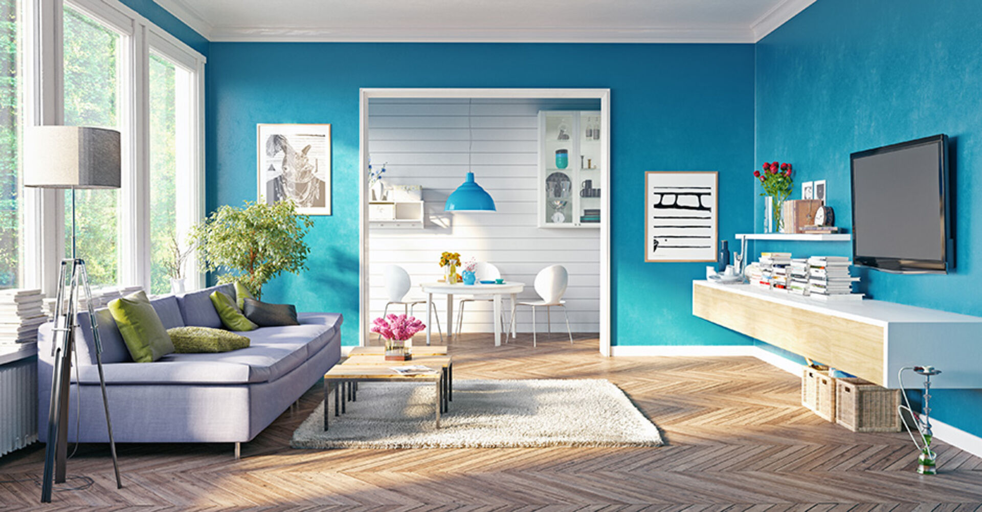 Wissenschaftliche Frschungen haben gezeigt, dass die Farbe Blau den Blutdruck senkt, müde macht und das Gefühl von Stress reduziert. Blaue Wände sind besonders im Schlafzimmer oder auch Wohnzimmer zu empfehlen.