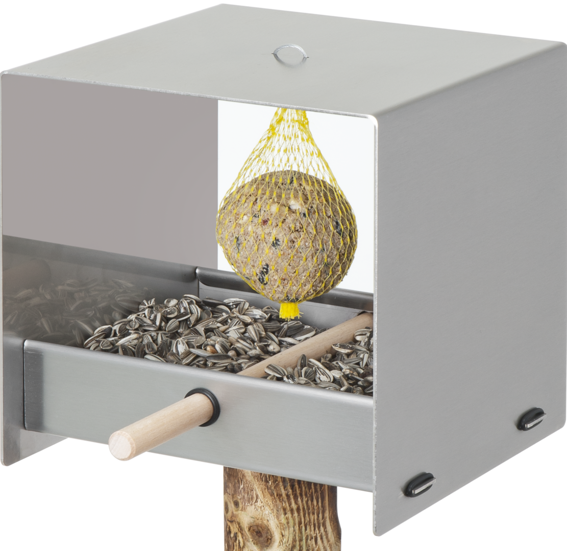 Neu ist der Rahmenfutterspender (EUR 44,95), der sich an der Fassade oder direkt am Küchenfenster anbringen lässt. Die Körner werden im schwarzen Rahmen in einer Vertiefung versteckt, so kann man Blau- und Kohlmeisen bestmöglich beobachten. In einem durchdachten Futterhäuschen aus Glas (EUR 99,95) finden die Vögelchen hingegen nicht nur jede Menge Köstlichkeiten vor, sondern auch eine integrierte Badewanne am Dach. www.evasolo.com