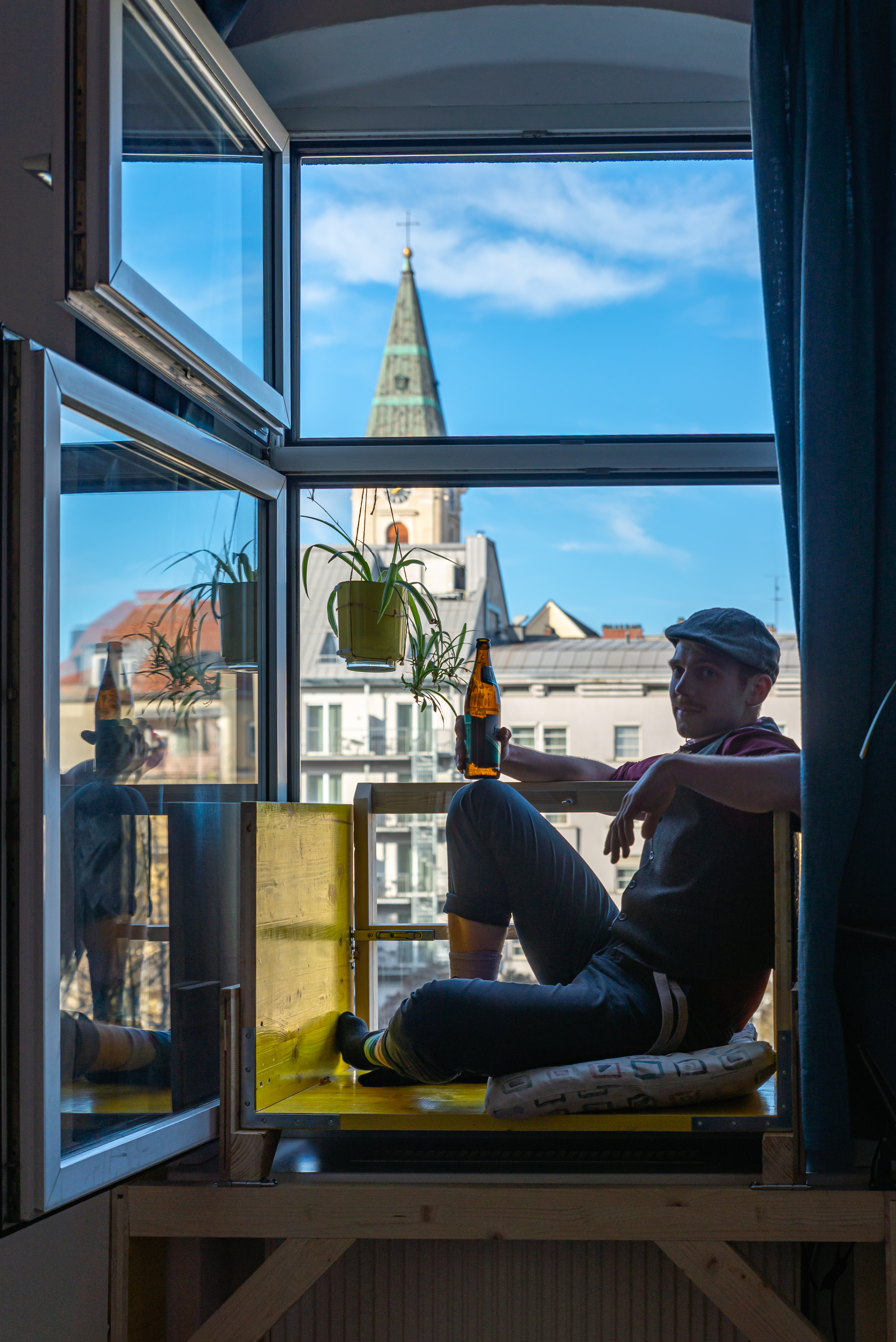 Einer dieser "Balkonlosen" war der Salzburger Florian Holzmayer, der seinen Lebensmittelpunkt in Linz hat. Er hatte die Idee zu "Balcosy" einem ausklappbaren Balkon, der sich nach Bedarf aus dem geöffneten Fenster klappen lässt. Wird er nicht benötigt, dient er unter dem Fenster als praktischer Schreibtisch. Zwei Fliegen mit einer Klappe: Home-Office Tool und Frischluftspender in einem.