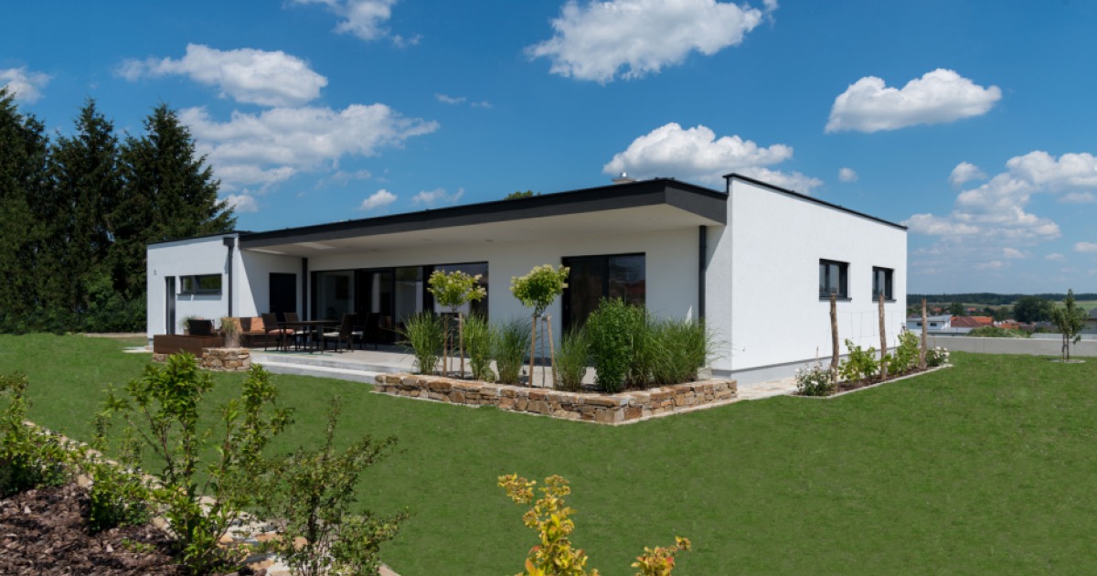 Der Bungalow besticht durch sein geradliniges, modernes Design. Eine fast durchgehende Fensterfront auf der einen Seite, kombiniert mit einem Flachdach sowie einem Vorsprung entlang der Terrasse sind die typischen Merkmale des Hausmodells. Der großzügige Wohn- und Essbereich mit integrierter Küche ist das Herz dieses Bungalows. Mit dem Schlafzimmer mit optional angrenzendem Schrankraum und zwei weiteren Zimmern, die auf Wunsch auch getauscht werden können, entsteht ein separater Ruhe- und Schlafbereich. Der zentrale Flur verbindet alle Räume dieses 132 m² großen Bungalows miteinander.
