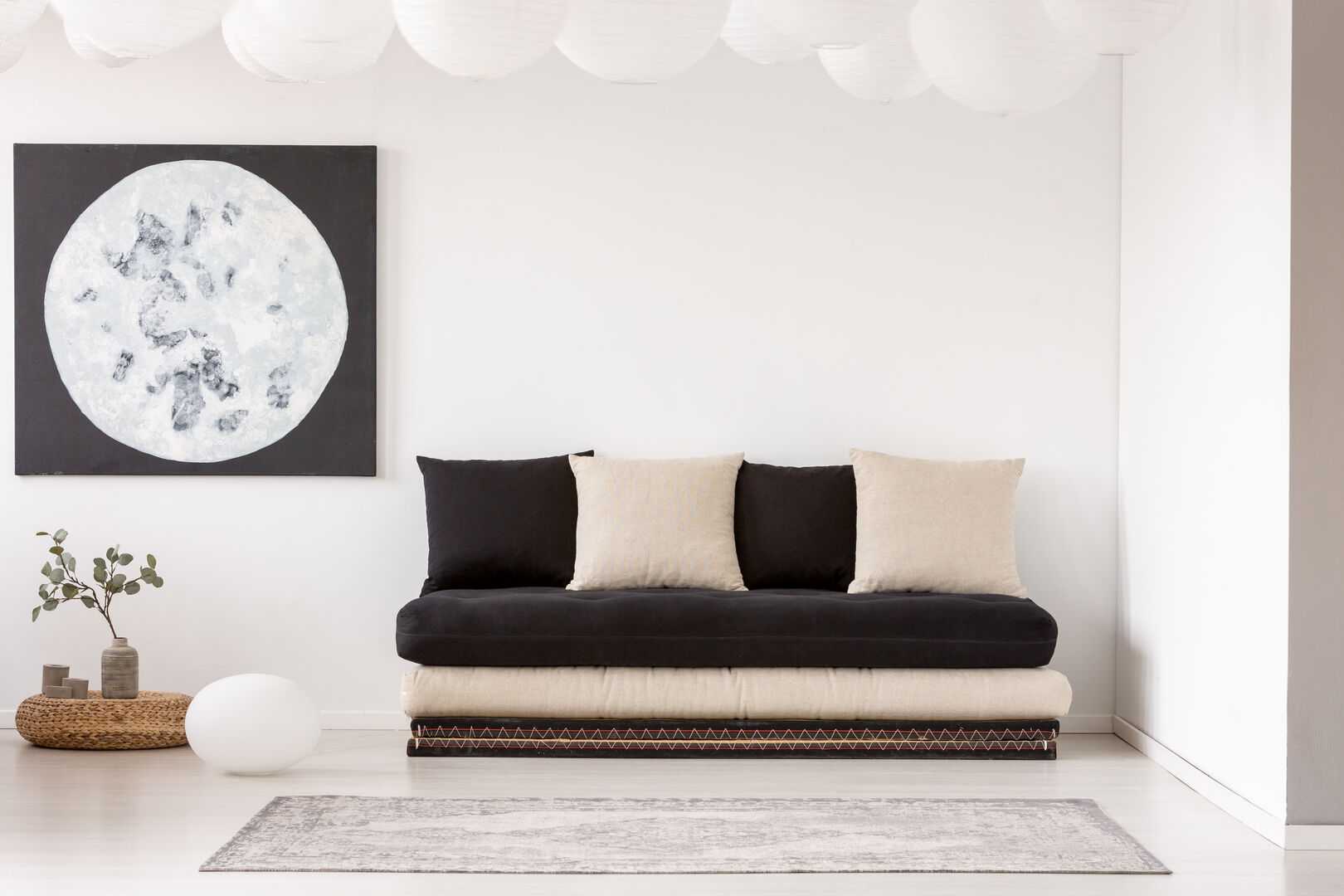 Bei Japandi wird die helle Farbpalette Skandinaviens durch die dunklen Töne Japans erweitert. Es bietet sich an, helle Möbel mit dunklen Accessoires zu verbinden. Vor allem schwarze Stilelemente sorgen für einen starken Kontrast und strahlen Eleganz aus. Apropos Deko: Die darf trotz der Schlichtheit auch beim Japandi-Stil nicht vernachlässigt werden. Schnickschnack ist ein Tabu, bei Japandi stehen nämlich sorgfältig ausgewählte Elemente im Vordergrund. Kuschelige Decken und Kissen sorgen für nordische Gemütlichkeit, Vasen und Skulpturen spiegeln die unaufgeregte Einrichtung Japans wider. Das Wabi-Sabi-Konzept wird besonders schön durch geknickte Äste verdeutlicht. Die einzelnen Elemente dürfen übrigens gerne einen Statement-Charakter aufweisen. Was beim Trend noch gewollt ist? Leere Ecken, denn nicht jeder Platz muss ausgefüllt sein. Das mag anfangs noch etwas ungewohnt sein, sorgt jedoch dafür, dass die restliche Einrichtung so richtig zur Geltung kommt. Unkompliziert, einfach, stilsicher – Japandi eben.