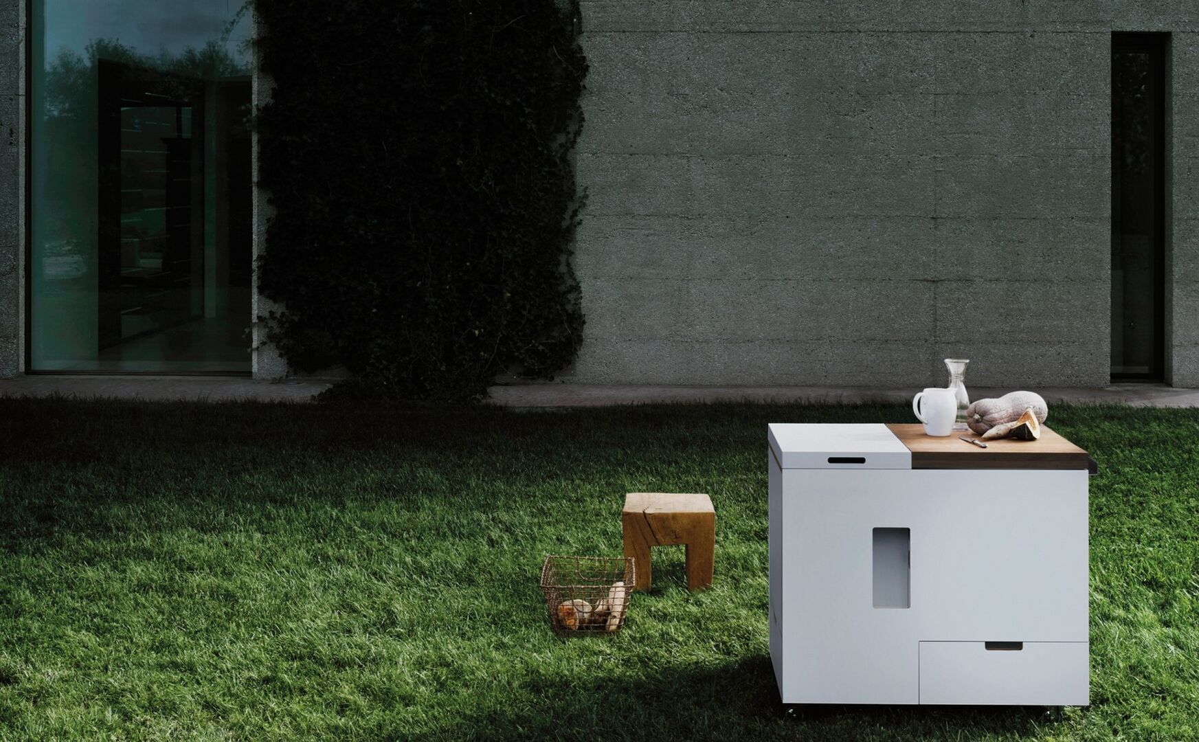 cEs ist ihr nicht anzusehen, doch die „Minikitchen“ von Boffi hat es im wahrsten Sinne des Wortes in sich: Dank des cleveren Stausystems im Inneren des Kubus finden darin Kochplatte, Mini-Kühlschrank, Schubläden, Kästen, integrierte Steckdosen, ein Küchenbrett sowie eine ausziehbare Arbeitsplatte Platz. Dem nicht genug, hat die Miniküche auch Designgeschichte geschrieben – sie wurde 1963 von Designer Joe Colombo entworfen und wirkt nach knapp 60 Jahren immer noch modern und zeitlos. Im Jahr 2012 hat Boffi die Miniküche deshalb auch als Outdoor-Variante auf den Markt gebracht.