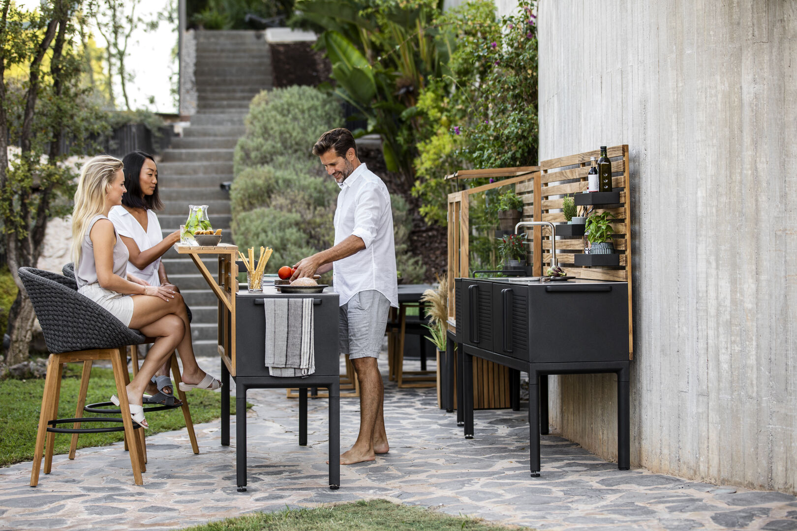 Was aber ist die perfekte Grillparty ohne den sommerlichen Aperitif, kühle Cocktails und die nötigen Erfrischungen? Ideal, und übrigens auch überaus stylish, ist die Outdoor-Bar, die im Laufe des Abends garantiert auch zum geselligen Zentrum wird – egal ob in Form eines praktischen Hochtisches samt integriertem Kühlfach, als mobiles Barmodul auf Rollen oder als fix platziertes Theken-Element. Und wer noch eine Ecke frei hat im Garten oder auf der Terrasse, kann über eine Cooling-Station nachdenken – der italienische Outdoor-Spezialist Abimis hat darin ein Spülbecken samt Wasseranschluss, einen Kühlschrank und eine Eismaschine verpackt, inklusive Stauraum für die nötigen Gläser und Cocktailutensilien.