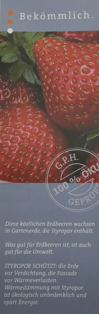 Über folgendem Werbeflyer, der Erdbeeren zeigt, steht folgendes: „Diese köstlichen Erdbeeren wachsen in Gartenerde, die Styropor enthält. Was gut für die Erdbeeren ist, ist auch gut für die Umwelt. Styropor schützt: die Erde vor Verdichtung, die Fassade vor Wärmeverlusten.“