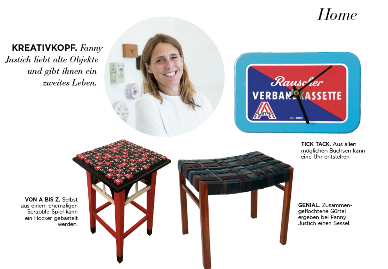 Aus Gegenständen, Möbelstücken und „Kleinkram“ etwas Neues zaubern ist der Arbeitsalltag der Grazerin Fanny Justich. Die studierte Architektin sammelt Objekte, die sie auf Flohmärkten, im Internet oder in Second-Hand-Läden findet. Täglich verbringt Fanny viele Stunden in ihrer Werkstatt und haucht mit viel Kreativität und handwerklichem Geschick Dingen neues Leben ein. So fertigt der „Upcycling-Profi“ aus gebrauchten Ledergürteln einen Stuhl, aus Puppen einen Lampenständer oder wertet Büchsen mit einem Uhrwerk auf. „Das Besondere an meinen Produkten ist, dass es Unikate sind. Jeder Gegenstand hat eine Geschichte“, erzählt uns Fanny in ihrem Atelier in der Grazer Alberstraße, wo Interessierte unter Voranmeldung gerne empfangen werden.