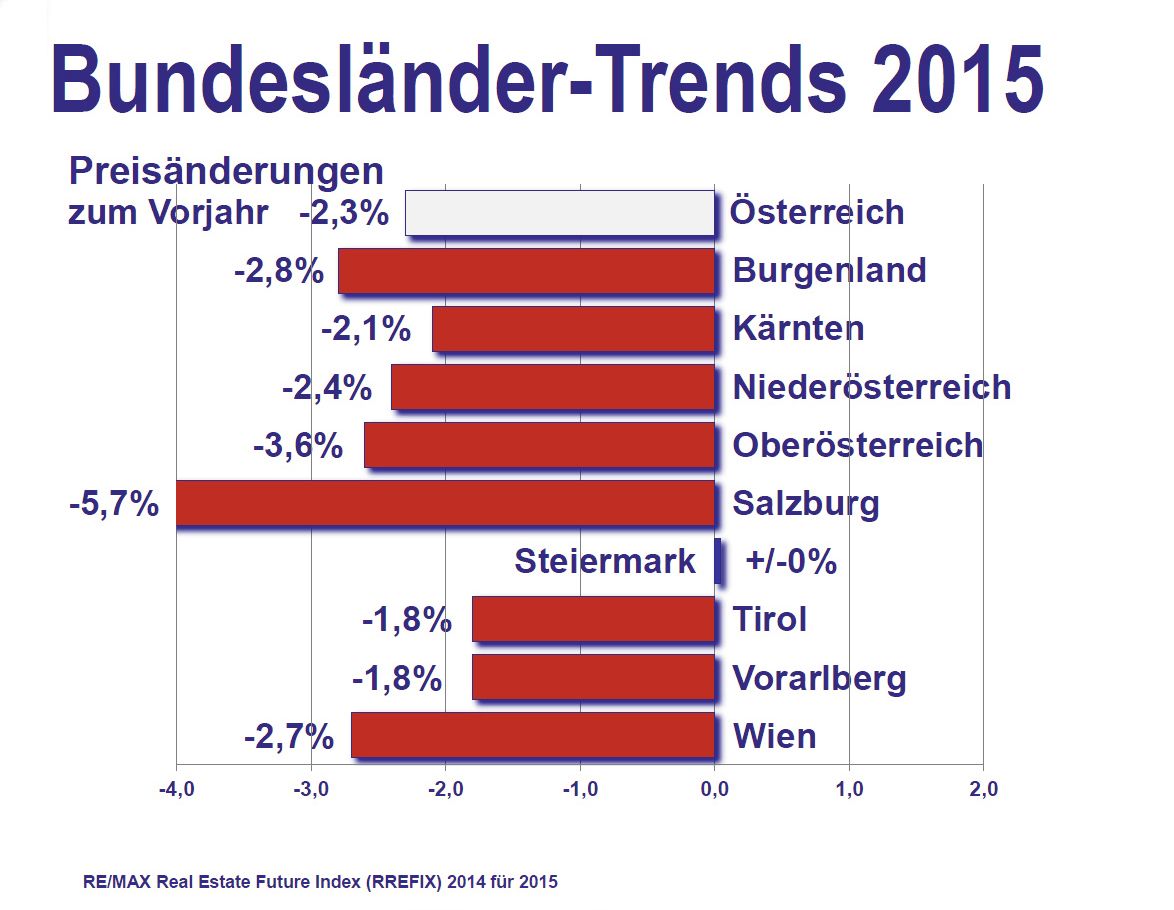 Das drückt die Immobilien-Preise über alle Objekt-Kategorien um minus 1,8 Prozent. „In Vorarlberg sind 2014, im Vergleich zum schwachen Jahr 2013, die Immobilienverkäufe laut Grundbuch um über 15 Prozent gestiegen“, erklärt Reinhard Götze, Chef von RE/MAX Immowest mit Büros in Bregenz, Dornbirn und Götzis. „Die Anzahl der Immobilienverkäufe des Rekordjahres 2012 wurde nicht erreicht, der Markt ist generell ruhiger, die Nachfrage im zweiten Halbjahr verhaltener. Derzeit sind die Ressourcen bei den potenziellen Käufern deutlich geringer als noch vor einigen Jahren bzw. haben bereits viele Käufer in Immobilien investiert. Zudem ist die Rendite bei Immobilien gefallen“, erklärt Reinhard Götze, einer der erfolgreichsten Makler Österreichs. In Vorarlberg erfreut sich das Maklernetzwerk RE/MAX über ein Umsatzplus von deutlich über 20 %.