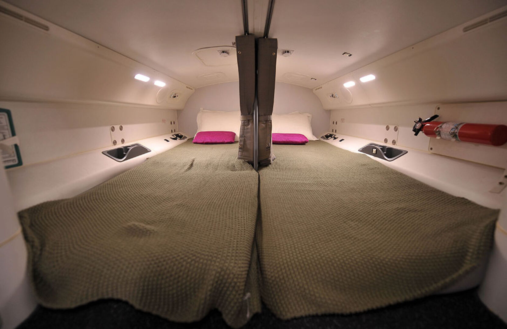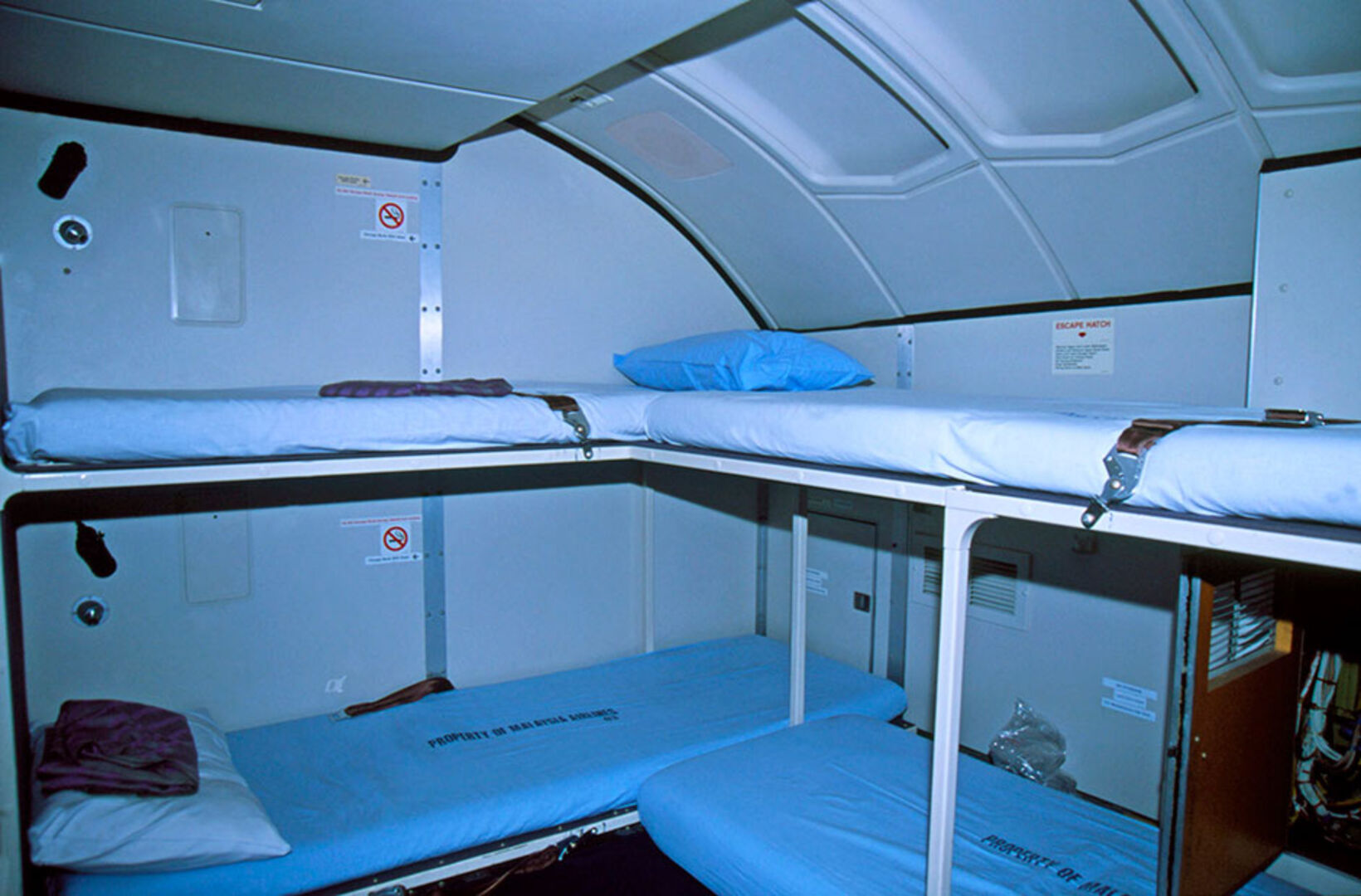 Die meisten Boing-Maschinen sind mit versteckten Treppen ausgestattet, die in den Schlafbereich der Flugbegleiter führen. Die Betten befinden sich dann über dem Cockpit der Piloten und sehen so aus: