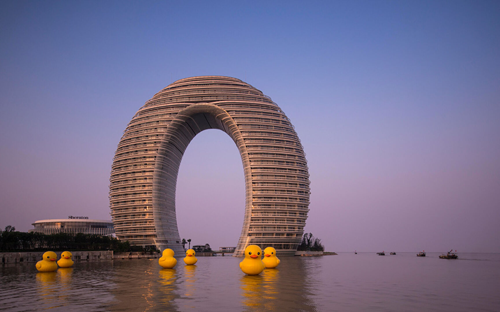 Das Sheraton Huzhou Hot Spring Resort ist ein Luxushotel, das insgesamt 27 Stöcke umfasst. Die Form des Hotelgebäudes in Huzhou in China erinnert an ein…