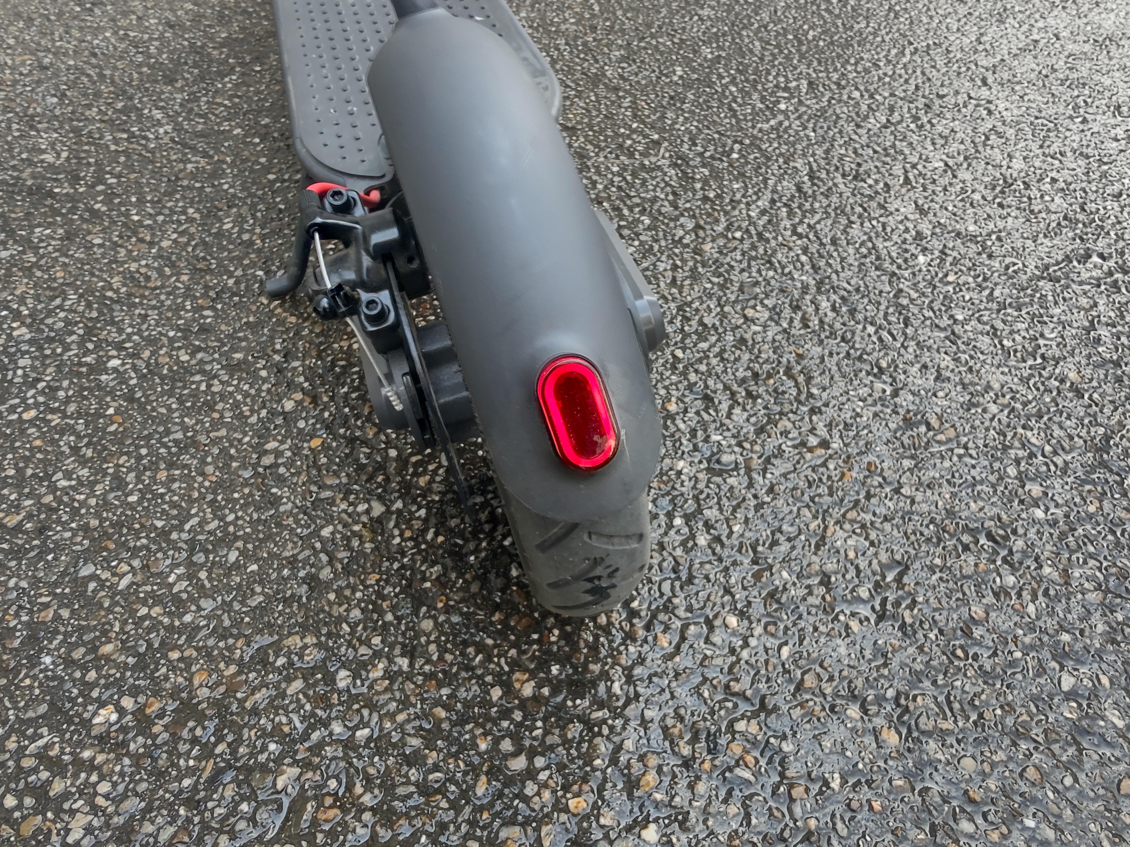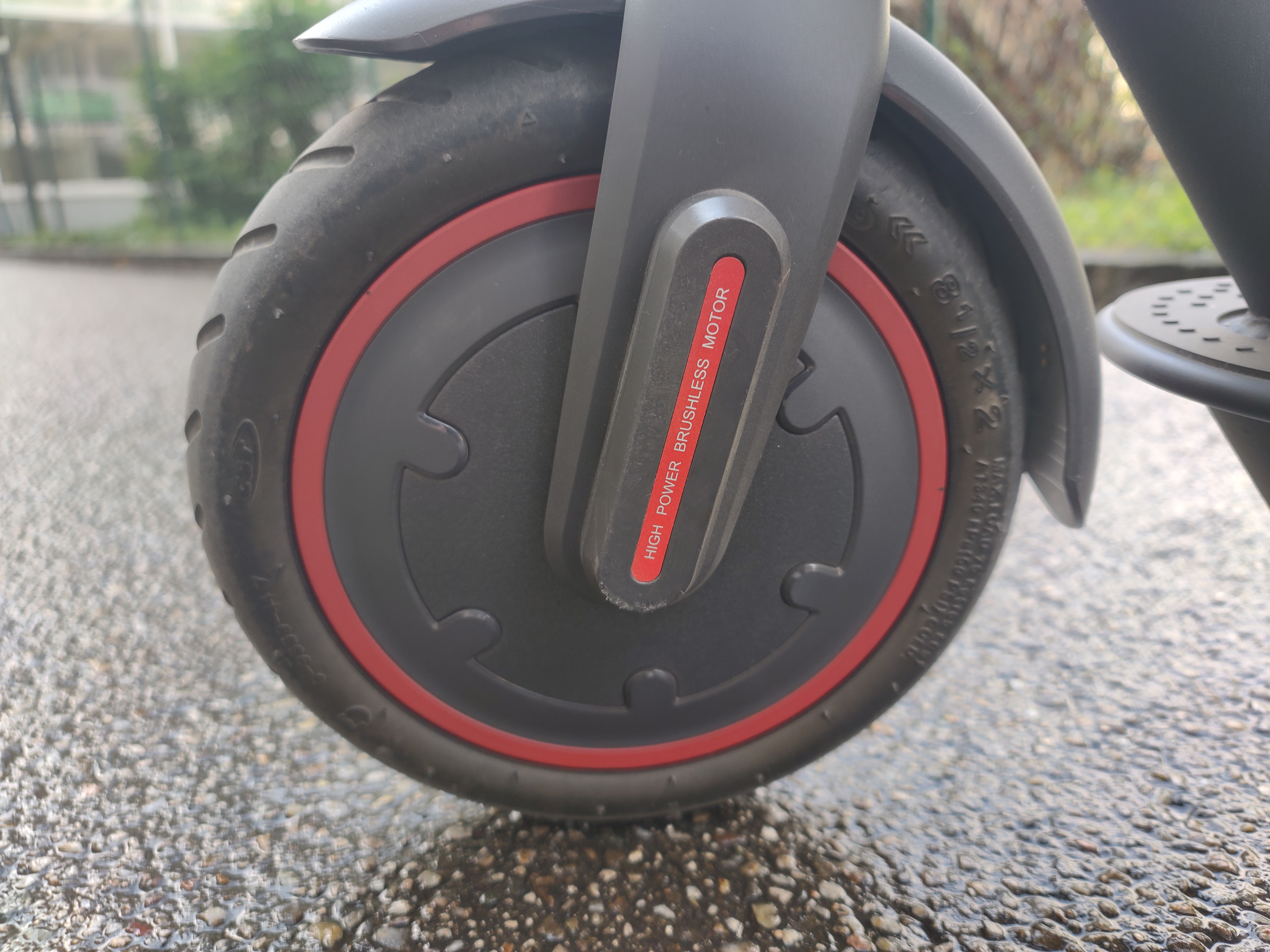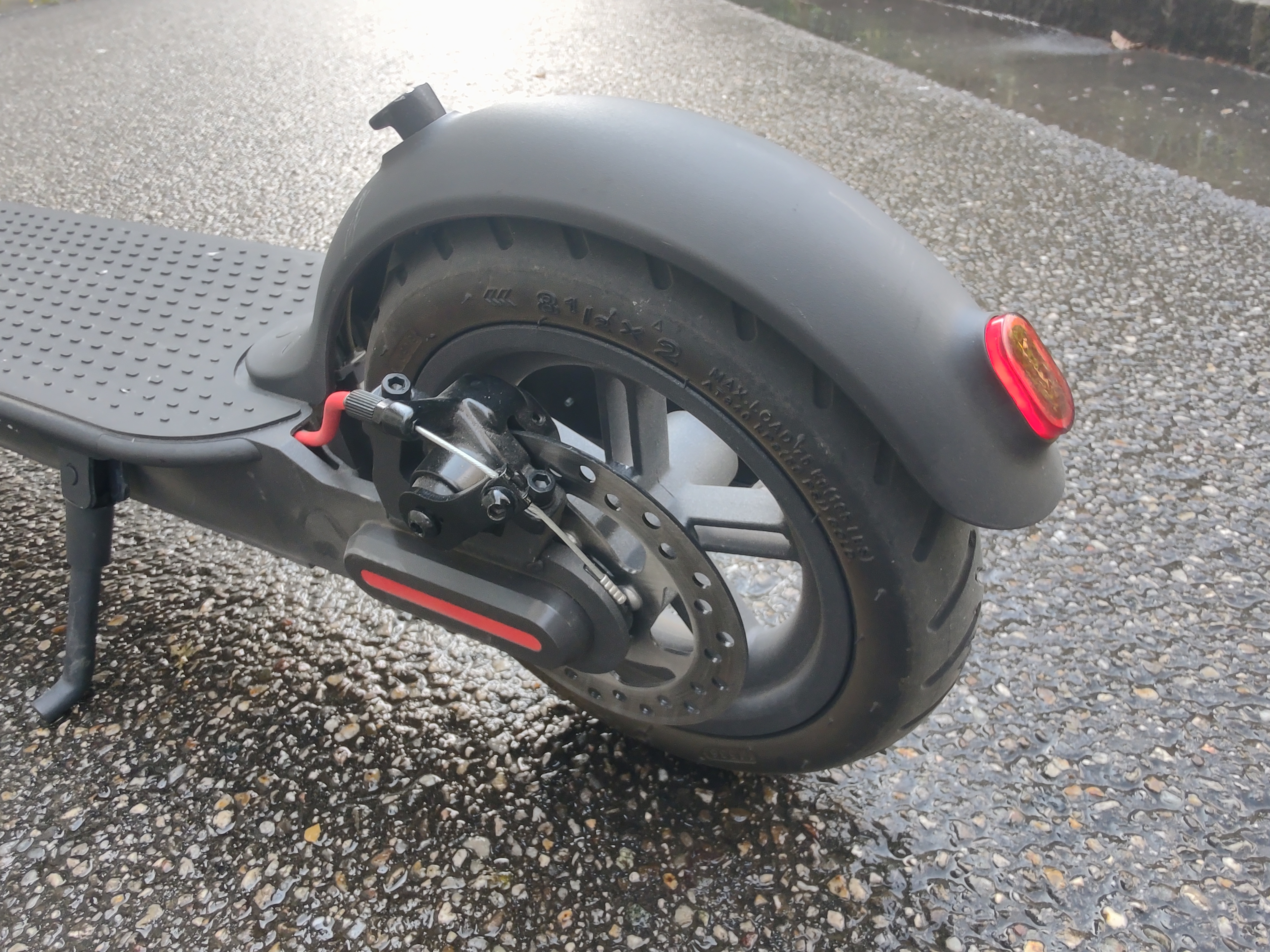 Der Xiaomi Electric Scooter Pro ist ein recht auffälllig designtes Kerlchen. Die Luftreifen werden durch rote Akzente unterstrichen, auf dem Hinterrad findet sich die Scheibenbremse, die per Hebel an der Lenkstange zu betätigen ist. Das matte Grau passt sehr gut zum Gerät, die farblichen Akzente heben sich hervorragend ab und geben dem Scooter einen futuristischen Look. Die Batterie ist im Unterboden untergebracht, daher ist der Schwerpunkt des Geräts sehr gut ausbalanciert. Ein Lichtsystem ist bereits eingebaut.