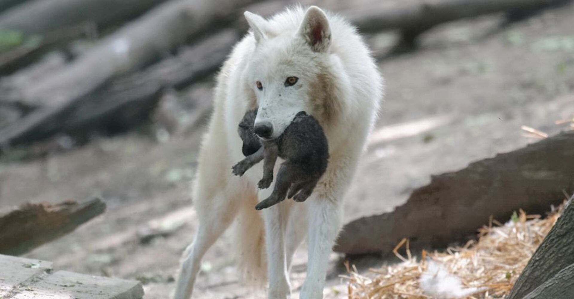 Mama Wolf zeigt ihren Welpen neues Zuhause im Tiergarten Schönbrunn