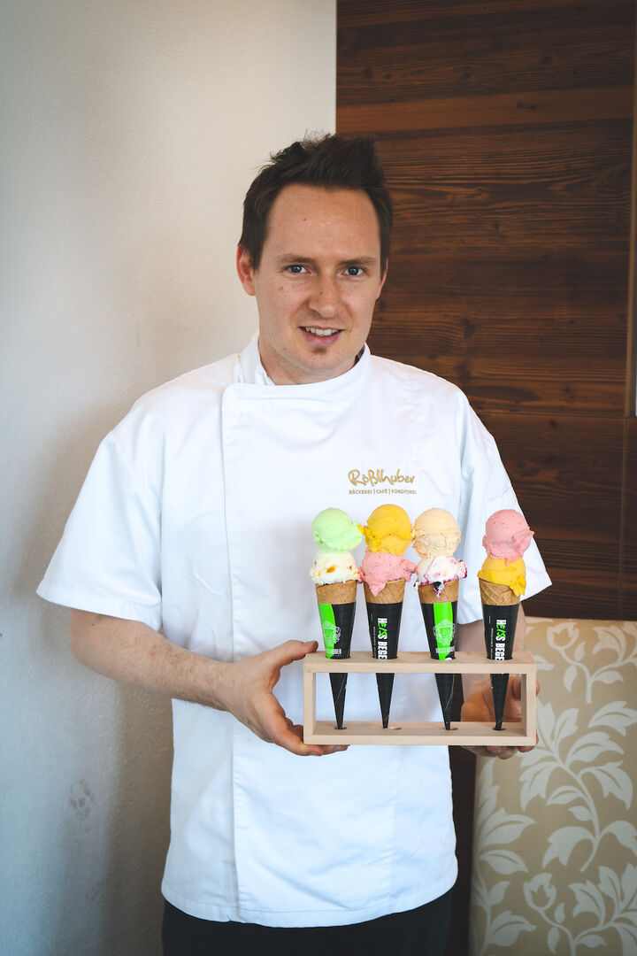 Mozart-, Snickers-, Erdbeer- oder Passionsfruchteis – im Café Rößlhuber in Bergheim wird selbst Hand angelegt, alle Eissorten werden seit 2013 mit frischen Zutaten von Chef Michael Rößlhuber persönlich produziert. „Mit der Herstellung von Eis habe ich mir einen Kindheitstraum erfüllt. Pro Saison verarbeiten wir rund 3.600 Liter Milch und 1.700 Liter Wasser für unsere vielfältigen Sorten“, erzählt der Eismacher. Welches sollte man auf alle Fälle kosten? „Meine Empfehlungen sind immer spezielle Eissorten, zum Beispiel Orange-Ingwer, Acai–Banane oder Süßkartoffel-Eis. Mein Liebling ist aber „Goldene Milch“ mit Kokos, Kurkuma, Ingwer, Zimt und Muskatnuss – bei richtiger Dosierung eine echte Geschmacksbombe!“