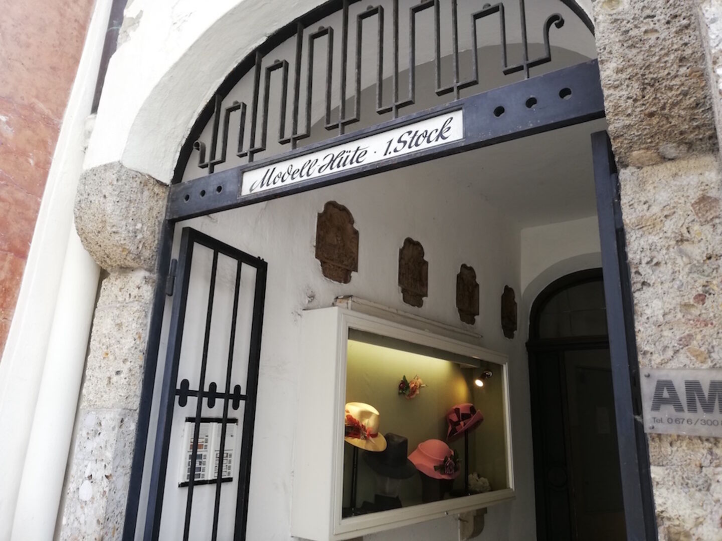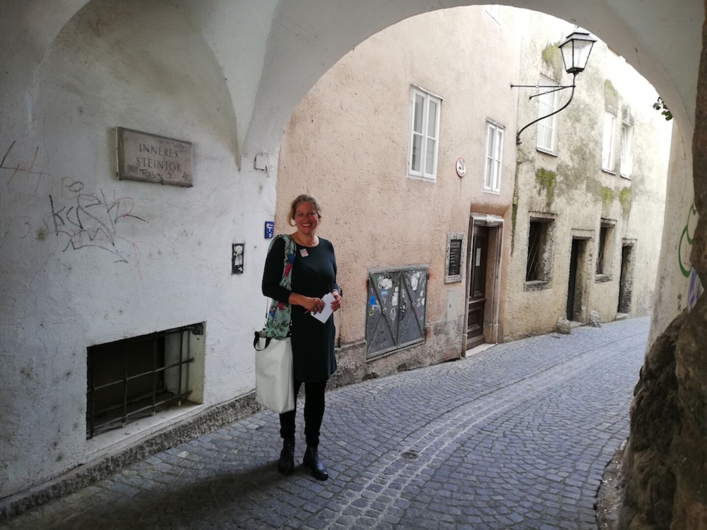 Über den Makartplatz, vorbei an der großen „Caldera“-Skulptur, spazieren wir Richtung Linzergasse bis zum alten Lederhaus, wo Inez Reichl-de Hoogh Richtung Dach zeigt. Dort befindet sich ein gut erhaltener Ziehhaken aus längst vergangenen Zeiten, womit einst die Lederhäute in die Obergeschosse gehievt wurden. Lederwaren Schliesselberger zählt zu den ältesten Betrieben Österreichs, dort gingen Lederer und Gerber bereits 1422 ihrem Gewerbe nach – Kolumbus entdeckte Amerika erst 70 Jahre später! Wir folgen nicht den üblichen Pfaden, sondern biegen links in das schmale „Königsgässchen“ ein, das direkt in die Linzergasse mündet. Residierten hier einst große Herrscher und Adelige? Weit gefehlt, dort wohnten die sogenannten „Nachtkönige“, deren Aufgabe es war, die Jauchegruben der Stadt zu säubern. „Im Mittelalter war die rechte Seite der Altstadt keine feine Gegend“, erzählt Reichl-de Hoogh. Hier wohnten die Handwerker, Bischöfe und Höherrangige hielten sich bevorzugt am linken Salzachufer auf.