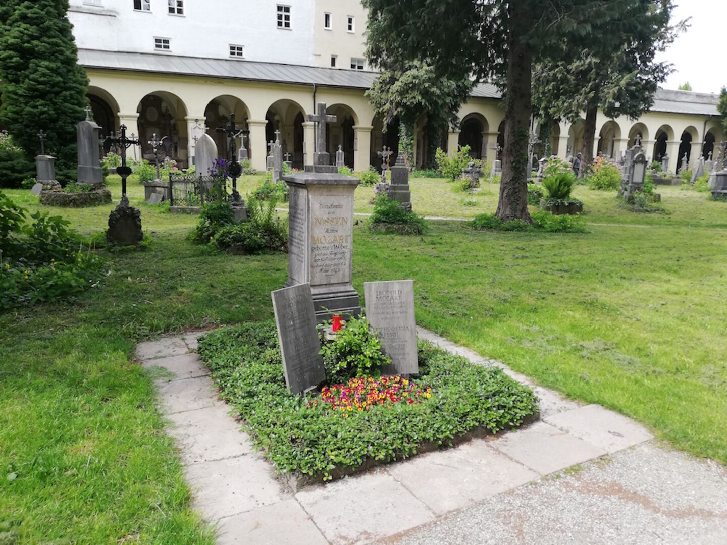 Für einen Samstagvormittag liegt eine eigenartige Ruhe in der Luft. Wir genießen es, die Stadt ohne laute Touristen zu erkunden. Unsere nächste Station ist der Bruderhof, den wir durch einen großen Torbogen betreten. „Hier befand sich früher das Hauptquartier der Feuerwehr, die bei Einsätzen mit Blaulicht die Linzergasse hinunter donnerte“, erzählt die Fremdenführerin. Bis zur Trockenlegung ab 1632 war die Gegend übrigens nicht viel mehr als Sumpf und Moor – sogar Malaria kursierte. In einem versteckten Eck befindet sich der Eingang zum Sebastiansfriedhof, der 1603 neu gestaltet wurde und wo u. a. Familie Mozart ihre letzte Ruhestätte fand. Knochen der berühmten Familie sind in diesem Grab allerdings keine mehr, Nannerl wurde zum Beispiel im Friedhof St. Peter beigesetzt. „Sie wäre heute eine Lady Gaga“, lächelt Reichl-de Hoogh. „Ihr Talent war herausragend, am Klavier hatte sie weitaus mehr drauf als ihr Bruder.“