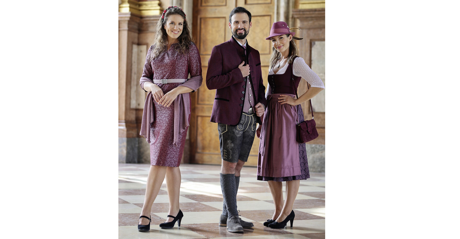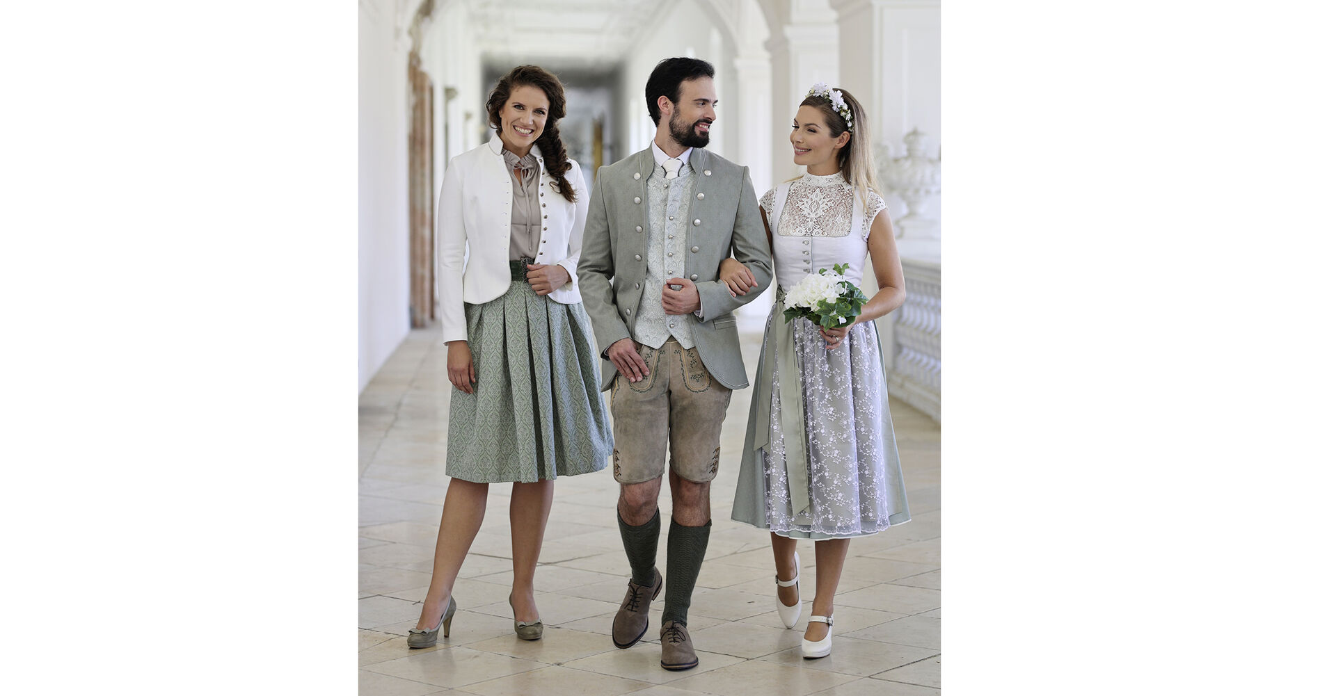 Trägerkleid mit Arm. Elegantes Dirndl mit Spitzenbluse. Herrenjacke mit Samteinfassung und dazu passendem Gilet sowie Hirschlederhose.