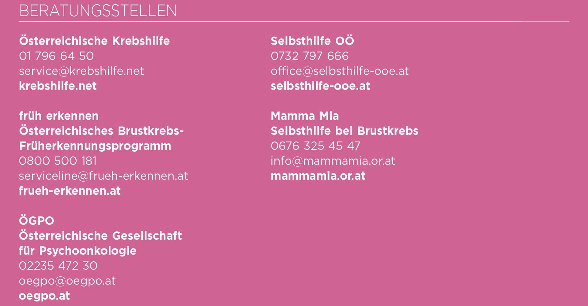 Zuhören und begleiten. Auch für Angehörige bedeutet die Diagnose eine große Umstellung. Wie verhält man sich in so einer Situation? So tun, als wäre alles beim Alten? Am besten ist es, die Betroffenen einfach zu fragen, was sie brauchen und womit man sie am besten unterstützen kann. Wenn Redebedarf besteht, sich Zeit für sie zu nehmen und ihnen auch zuzuhören. Wenn wichtige Termine anstehen oder in der Familie jemand gebraucht wird, der sich um Angehörige oder Haustiere der Erkrankten in deren Abwesenheit kümmert, einspringen. Es hilft, wenn sich die Erkrankten in dieser Zeit voll auf die eigene Genesung konzentrieren können. Am wichtigsten ist es aber, einfach da zu sein und auf ihre Bedürfnisse einzugehen. Die körperliche Erkrankung führt sehr häufig auch zu einer großen psychischen Belastung wie Niedergeschlagenheit und starken Ängsten vor der Behandlung und ihren Nebenwirkungen, vor der veränderten Lebenssituation, vor der Zukunft, vor Nachuntersuchungen, vor dem Sterben. Die Angst vor einem Rückfall kann Betroffene auch bei guter Prognose sehr lange begleiten. Manchmal wächst einem einfach alles über den Kopf und auch Familie und Freundeskreis will man nicht zu sehr mit den eigenen Ängsten und Problemen belasten. Die Auseinandersetzung mit der Krebserfahrung ist ein Prozess, und in dieser belastenden Ausnahmesituation kann ein Gespräch mit einer Psychologin oder einem Psychologen unterstützen, entlasten und neue Wege aufzeigen.