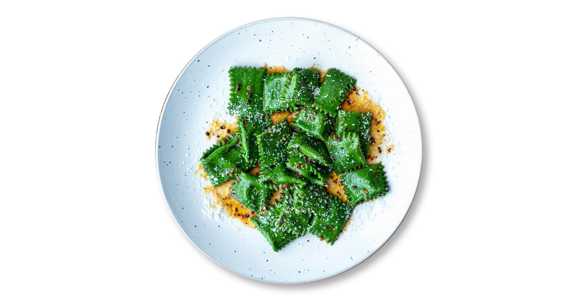 Ich koche eine Mischung aus alten, neuen und neu erfundenen Rezepten. Wenn ich ein traditionelles Rezept abwandle, dann meist, um ihm einen spielerischen Dreh zu geben: vielleicht mit einer ungewöhnlichen Zutat oder einfach nur einer lustigen -Farbe. Das Resultat basiert aber immer auf klassischen Prinzipien. Ein Lieblingsbeispiel von uns sind rauchige „Brenn-nessel-Agnolotti del Plin“ mit Chili-Öl. Brennnesseln werden traditionell für einige lange Nudelformen verwendet. Aber als sich unser Garten plötzlich mit Brennnesseln füllte, beschlossen wir, eine gefüllte Variante zu kreieren, mit einer kreativen Mischung der Zutaten. Etwas Einfaches, das den Klassiker ehrt, aber den Gaumen zeitgemäß anspricht.