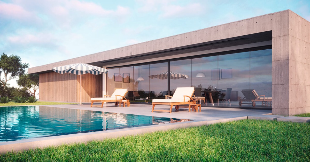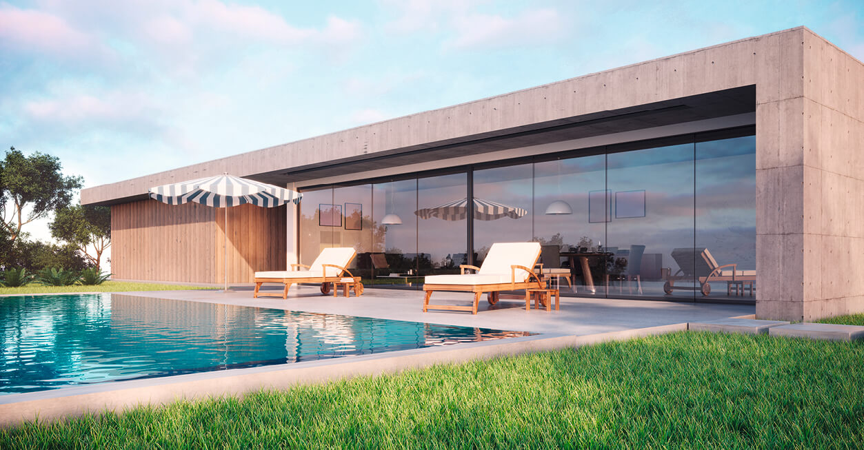 - Offen gestaltete Übergänge: Große Glasschiebe- bzw. Falttüren und rahmenlose Fenster lassen Terrasse und Wohnraum ineinander übergehen und verstärken das Gefühl von Weite.