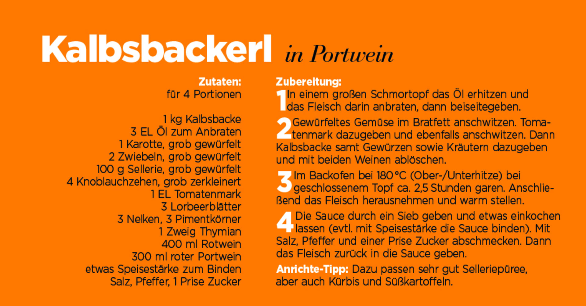 1. In einem großen Schmortopf das Öl erhitzen und das Fleisch darin anbraten, dann beiseitegeben. 2. Gewürfeltes Gemüse im Bratfett anschwitzen. 3. Tomatenmark dazugeben und ebenfalls anschwitzen. Dann Kalbsbacke samt Gewürzen sowie Kräutern dazugeben und mit beiden Weinen ablöschen. 4. Im Backofen bei 180 °C (Ober-/Unterhitze) bei geschlossenem Topf ca. 2,5 Stunden garen. 5. Anschließend das Fleisch herausnehmen und warm stellen. 6. Die Sauce durch ein Sieb geben und etwas einkochen lassen (evtl. mit Speisestärke die Sauce binden). Mit Salz, Pfeffer und einer Prise Zucker abschmecken. 7. Dann das Fleisch zurück in die Sauce geben.