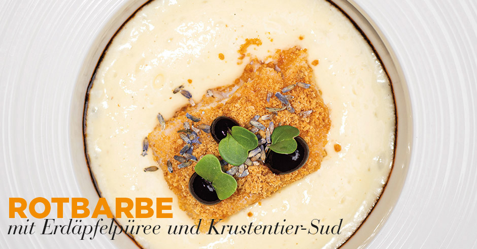 ANRICHTE-Tipp: Zuerst das Erdäpfelpüree, dann kommt der Fisch und darüber 1 EL Brösel streuen – mit dem Krustentierschaum finalisieren.