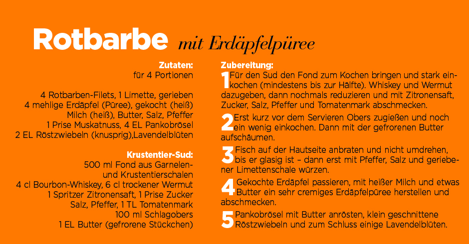 1. Für den Sud den Fond zum Kochen bringen und stark einkochen (mindestens bis zur Hälfte). Whiskey und Wermut dazugeben, dann nochmals reduzieren und mit Zitronensaft, Zucker, Salz, Pfeffer und Tomatenmark abschmecken. 2. Erst kurz vor dem Servieren Obers zugießen und noch ein wenig einkochen. Dann mit der gefrorenen Butter aufschäumen. 3. Fisch auf der Hautseite anbraten und nicht umdrehen, bis er glasig ist – dann erst mit Pfeffer, Salz und geriebener Limettenschale würzen. 4. Gekochte Erdäpfel passieren, mit heißer Milch und etwas Butter ein sehr cremiges Erdäpfelpüree herstellen und abschmecken. 5. Pankobrösel mit Butter anrösten, klein geschnittene Röstzwiebeln und zum Schluss einige Lavendelblüten (Achtung: Nicht zu viele – hier ist weniger mehr!) zugeben.